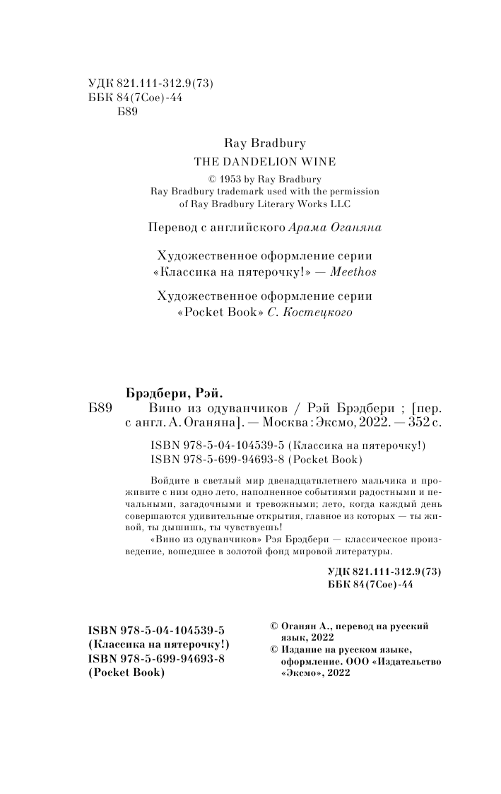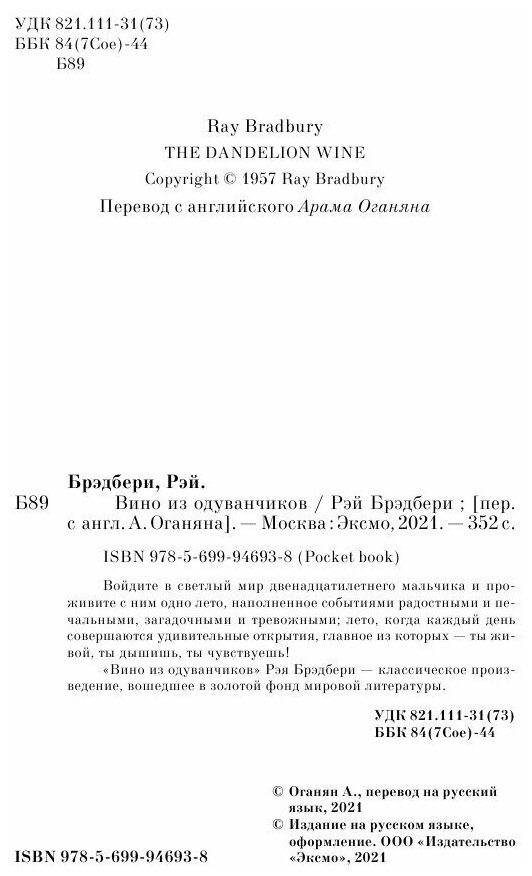 Книга: Вино из одуванчиков (Брэдбери Рэй , Оганян Арам (переводчик)); Эксмо, 2017