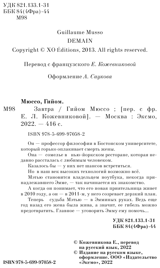 Книга: Завтра (Мюссо Гийом , Кожевникова Екатерина Львовна (переводчик)); Эксмо, 2017