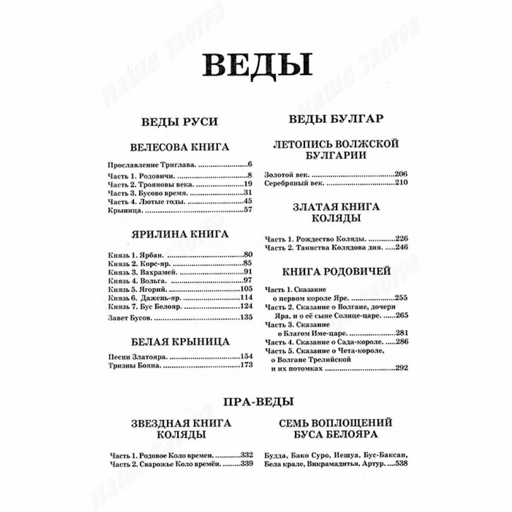 Книга Вед содержит летописи, ведические сказания и эпос Древней Руси, Волжской Булгарии, а также Болгарии Балканской и делится на "Веды Руси" и "Веды Булгар". "Веды Руси" содержат "Велесову книгу" - священное писание славян IX века; "Ярилину книгу" - русколанскую летопись, повествующую об истории Русолани, или Руси Аланской.