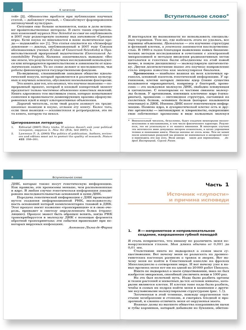 Книга удивительная. Полистав её бегло, вы можете подумать, что держите в руках учебник по молекулярной генетике - очень уж много серьёзных иллюстраций, таблиц, схем и списки литературы нешуточные. Но когда начинаете читать, первое впечатление быстро улетучивается. Книга написана действительно как исповедь, поэтому речь часто ведётся от первого лица - самой хромосомы. Неизбежно в этом случае и обилие юмора. Однако книга написана настоящим учёным, который понимает о чём говорит, так что он может себе позволить посмеяться. Мне кажется, что баланс серьёзного и развлекательного в книге хорошо выдержан. Плюс книги ещё и в том, что она достаточно "свежая" и даёт современное представление о теме. Очень порадовало качество иллюстраций - они цветные и их много! У "Похвалы глупости хромосомы" можно отметить недурственную полиграфию (этим сейчас может похвастаться не каждая научно-популярная книга). В общем, у Лима-де-Фария получилось сделать отличное введение в современную молекулярную генетику, очень полезное для учащихся и студентов. Подтверждением тому служит уже 3-е издание.
