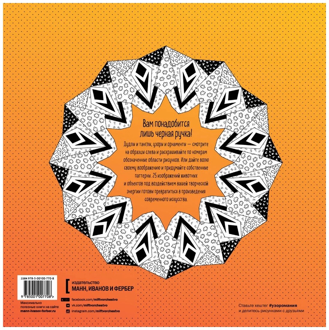 МИФ выпустил очередную прекрасную книгу. К ней не нужно запасаться огромным количеством карандашей, фломастеров и прочих материалов. Достаточно всего лишь одной черной ручки, но можно и поэкспериментировать с цветом. Каждая картина на отдельном листе, так что можно использовать любые материалы.