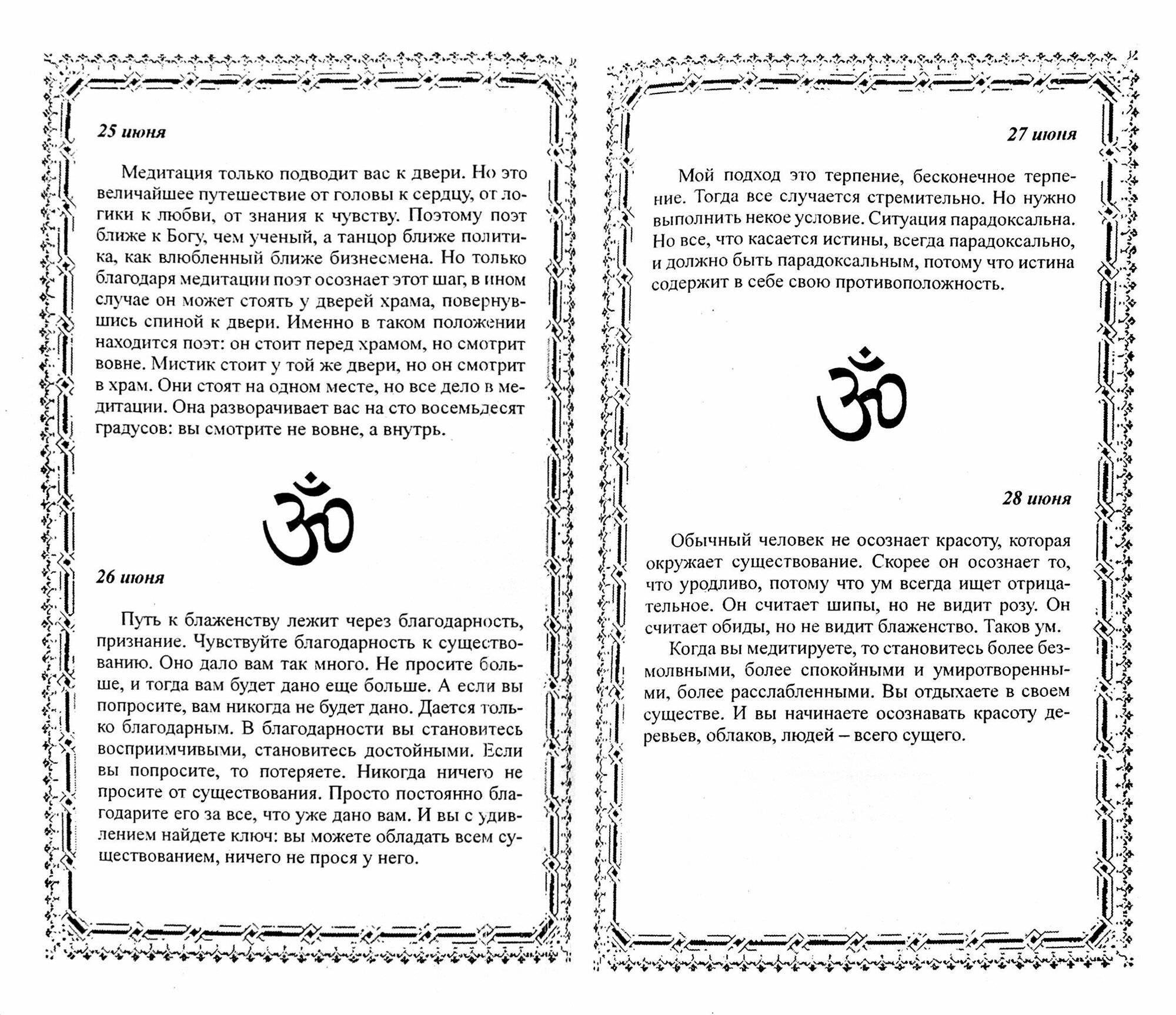В книге нет конкретных рекомендаций по выполнению медитаций, только набор изречений на каждый день, в этом вся книга. Я очень разочарована, ожидала от книги последовательность действий для самой медитации, те инструкцию, в этой книге этого нет, сожалею, что поторопилась с выбором.