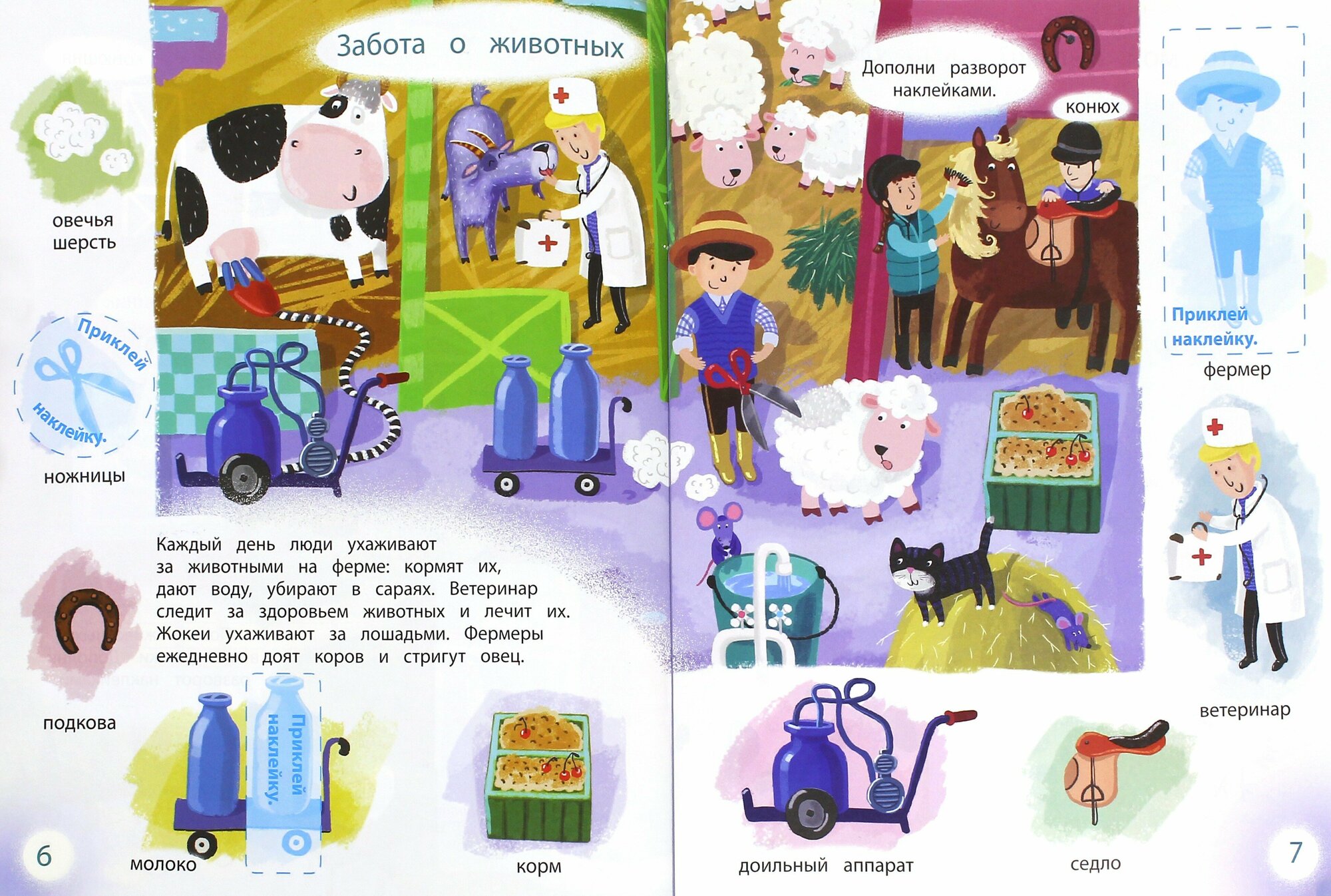 Яркая, красочная книжка-развивашка с разнообразными заданиями. По ней мы сходили на экскурсию на ферму и познакомились с её жителями, некоторых наклеили сами, что нам очень понравилось:) А самое интересное - это творческое задание в конце книги - мы сами сделали свою миниферму. Конечно, вырезал и склеивал папа, но и малышка участвовала активно и кое-что помогала:) Очень хорошее оформление, иллюстрации наполнены многими деталями, есть, что рассмотреть и рассказать, наклейки удобные. Прекрасная серия развивающих игровых книг!