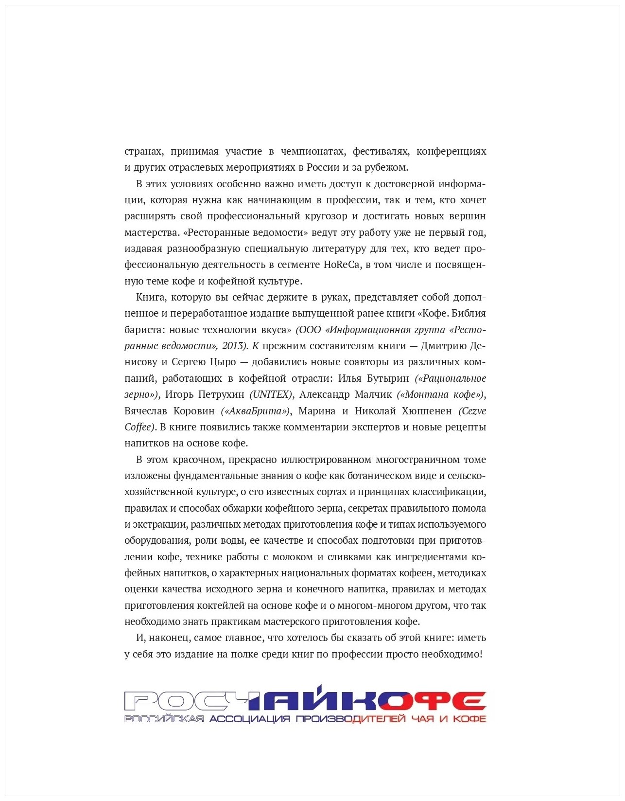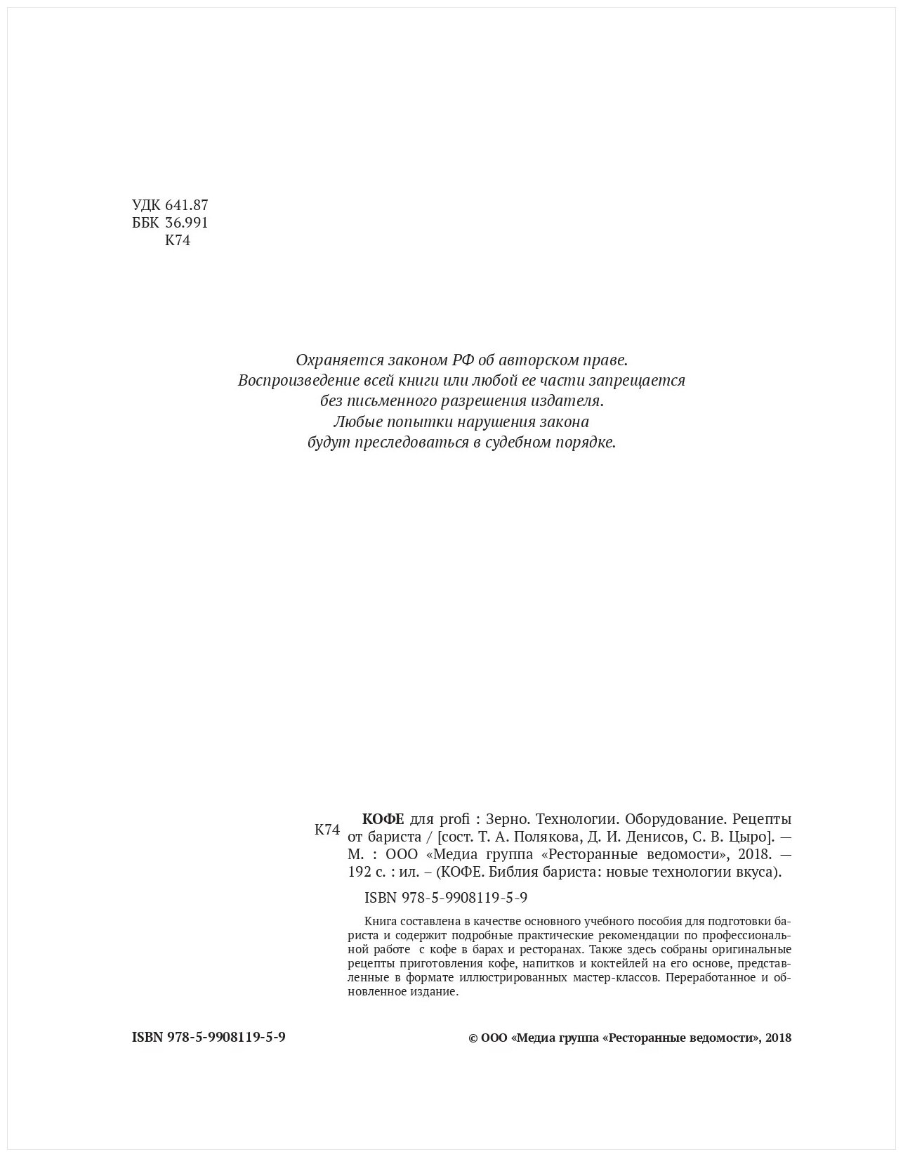 Кофе для profi. Зерно. Технологии. Оборудование. Рецепты от бариста (Полякова Татьяна Александровна; Денисов Дмитрий Иванович; Цыро Сергей Викторович); Ресторанные ведомости, 2017