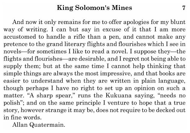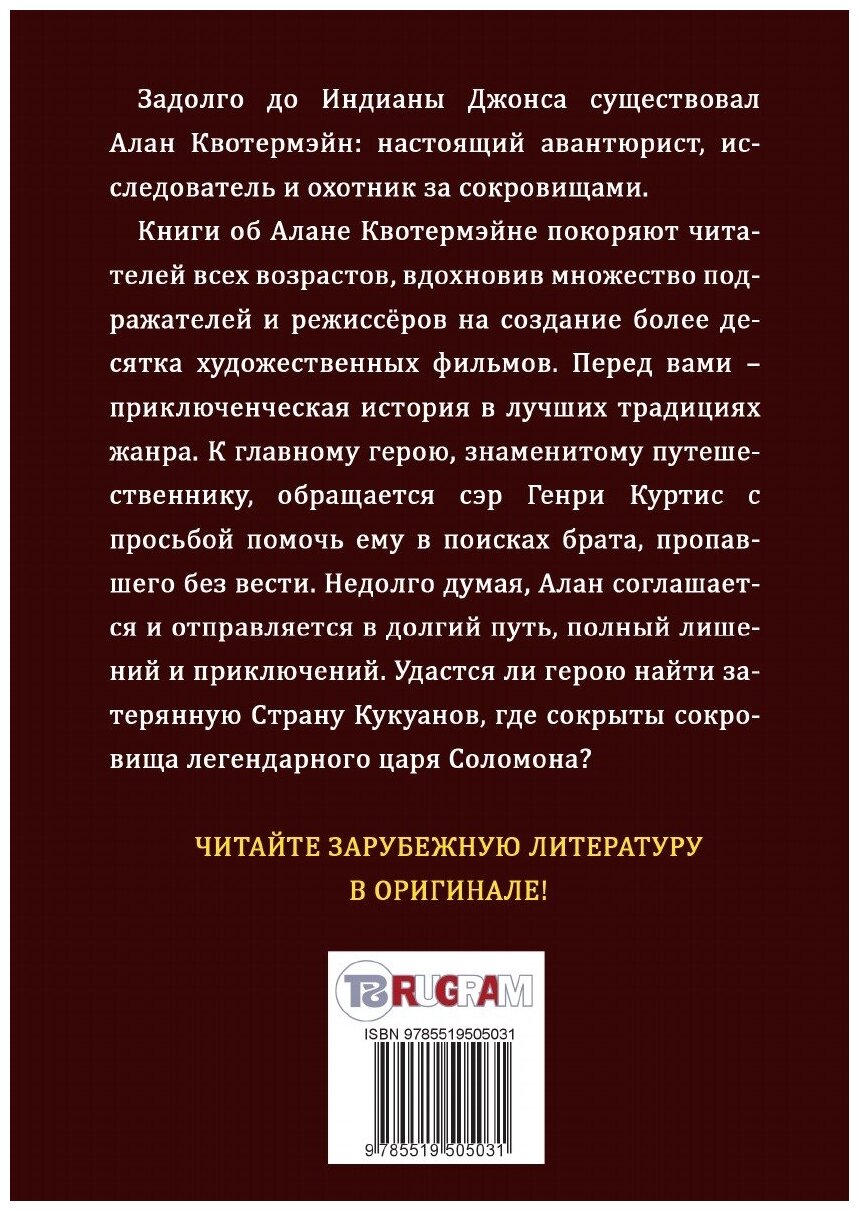 Книги об Алане Квотермэйне покоряют читателей всех возрастов, вдохновив множество подражателей и режиссёров на создание более десятка художественных фильмов. Перед вами - приключенческая история в лучших традициях жанра. К главному герою, знаменитому путешественнику, обращается сэр Генри Куртис с просьбой помочь ему в поисках брата, пропавшего без вести. Недолго думая, Алан соглашается и отправляется в долгий путь, полный лишений и приключений. Удастся ли герою найти затерянную Страну Кукуанов, где сокрыты сокровища легендарного царя Соломона?