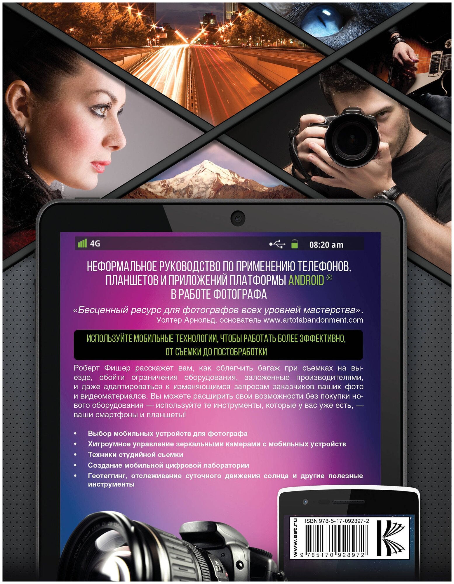 Неформальное руководство по применению телефонов, планшетов и приложений платформы Android® в работе фотографа.Используйте мобильные технологии, чтобы работать более эффективно, от съемки до постобработки.Роберт Фишер расскажет вам, как облегчить багаж при съемках на выезде, обойти ограничения оборудования, заложенные производителями, и даже адаптироваться к изменяющимся запросам заказчиков ваших фото и видеоматериалов. Вы можете расширить свои возможности без покупки нового оборудования – используйте те инструменты, которые у вас уже есть, – ваши смартфоны и планшеты!– Выбор мобильных устройств для фотографа;– Хитроумное управление зеркальными камерами с мобильных устройств;– Техники студийной съемки;– Создание мобильной цифровой лаборатории;– Геотеггинг, отслеживание суточного движения солнца и другие полезные инструменты.