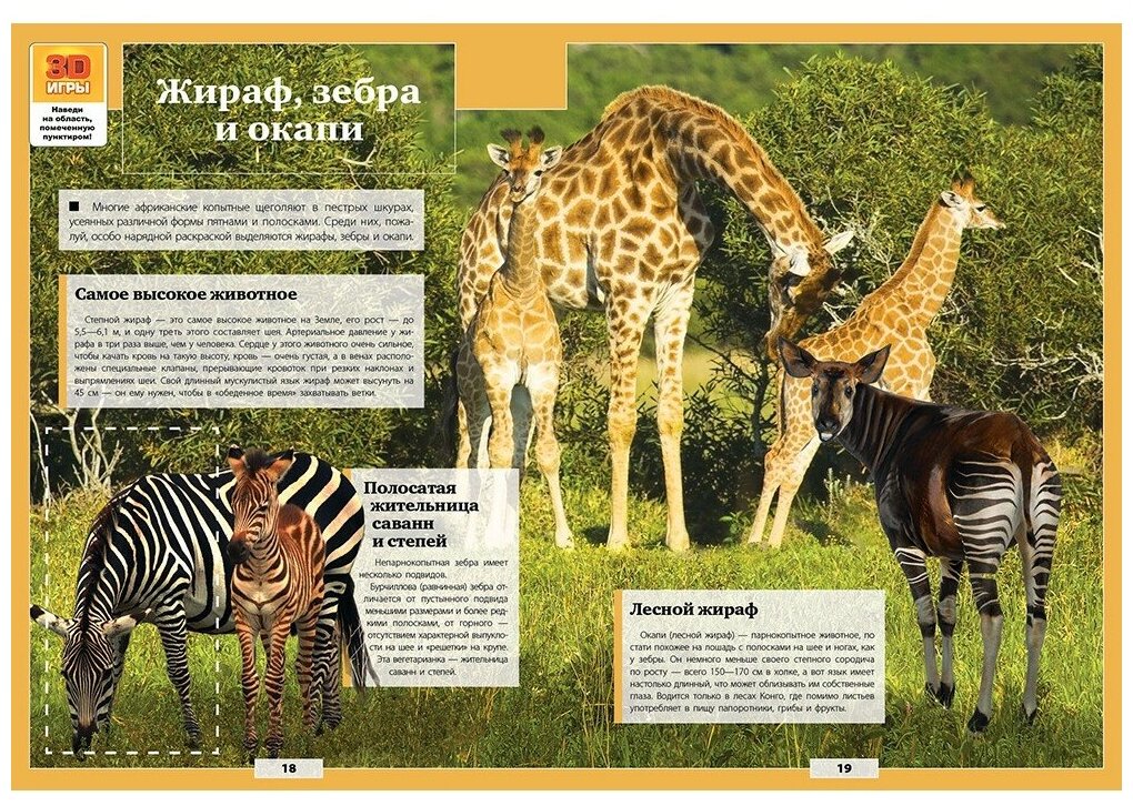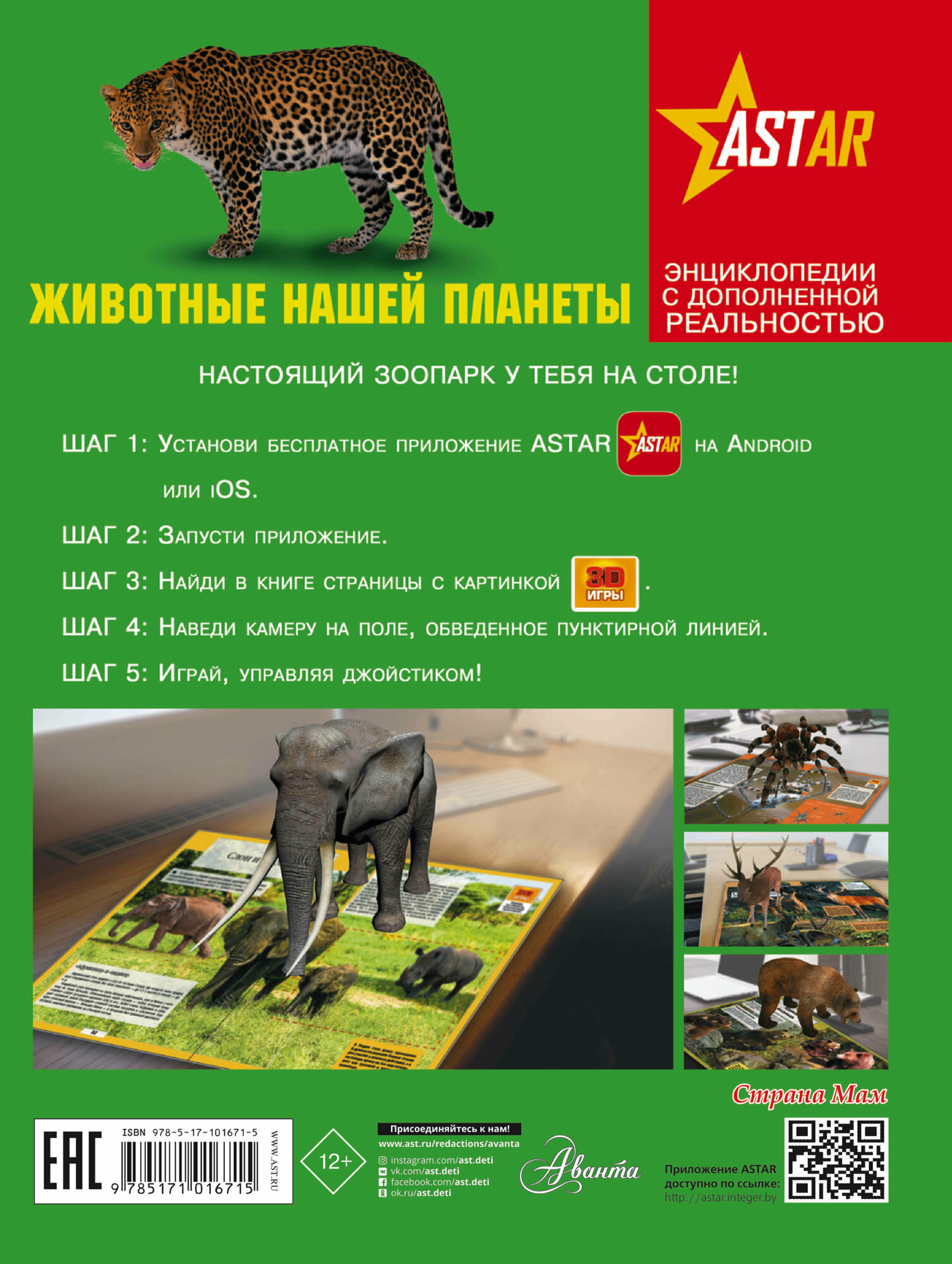 На нашей планете обитает огромное множество разнообразных животных. Но лишь считанных из них мы видели вживую. А ведь как было бы здорово потрепать по гриве царя зверей льва или прокатиться на слоне-великане. Всё это вполне возможно, если вы откроете эту книгу! Ведь у вас в руках уникальное издание с дополненной реальностью (AR) в формате интерактивных 3D-игр. Это значит, что вы не просто познакомитесь с животными Земли, читая текст и рассматривая иллюстрации, а увидите их в движении и объеме: перед вами предстанут длинношеий жираф, неповоротливый бегемот и даже кровожадный крокодил. Выполняйте задания и узнавайте больше о диких представителях фауны! А реалистичные визуальные и звуковые спецэффекты, которыми сопровождается игра, сделают чтение этой книги еще более увлекательным.