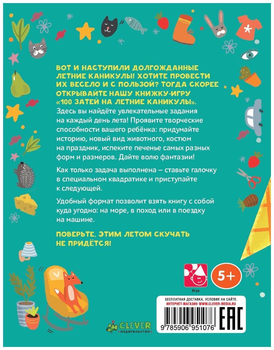 Вот и наступили долгожданные летние каникулы! Хотите провести их весело и с пользой? Тогда скорее открывайте яркую книжку-игру: внутри 100 увлекательный занятий на каждый день лета! Задания самые разнообразные: придумать историю, новый вид животного, костюм на праздник, испечь печенье, покормить птиц и многое-многое другое!