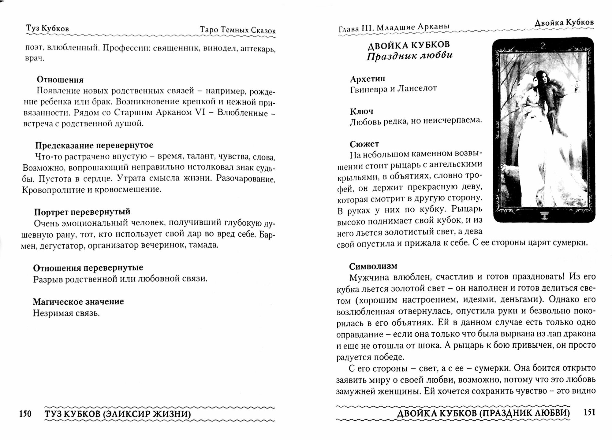 Таро "Тёмных сказок" у меня давно, потому и купила книгу. Колода не очень популярная и материалов по ней не так много. Каждая карта рассмотрена подробно и с разных сторон. Это и сюжет и портрет, символизм, место и т.д. И всё это сопровождается рассказом о путешествии Коломбины. Ещё мне понравилось то, что для каждой карты у автора нашлось краткое значение. Например для двойки пентаклей - золотая середина. Семёрка кубков - семь чудес. Король кубков - Заколдованный принц, а ассоциация к нему - Король-Рыбак.