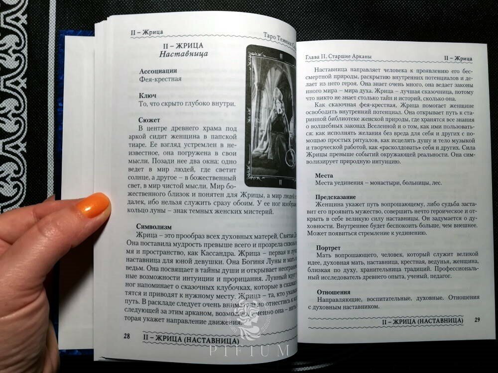Книга представляет собой методическое пособие к картам на 304 страницы. Виктория Волконская посвятила ее своей маме, которая дала ей первые уроки гадания Таро. В конце есть даже ссылка на ее группу в Контакте. Есть рисунки и понятные расклады. Само Таро Темных Сказок представлено, как сказочный инструмент. Это же пособие руководство по использованию его. К каждой карте дается описание ассоциаций, ключ, сюжет, описан символизм. Дается характеристика возможных предсказаний, портрет, характер отношений, магическое значение также к каждой карте. Для чтения удобно. В описании есть простота. Читать пособие интересно. Хорошо подходит для изучения. Цена может касаться высока, но сама книга уникальна, и потому оправдана она. Бумага чисто белая и не сказать чтобы тонка. Обложка прочная, сгодится на века. Выбрал эту книгу и колоду потому как склонен к сказкотворчеству, то есть написанию сказок. И понял, что с помощью такого инструмента можно совмещать и то и то. Спасибо автору и магазину. Советую приобрести всем книгу и само Таро.