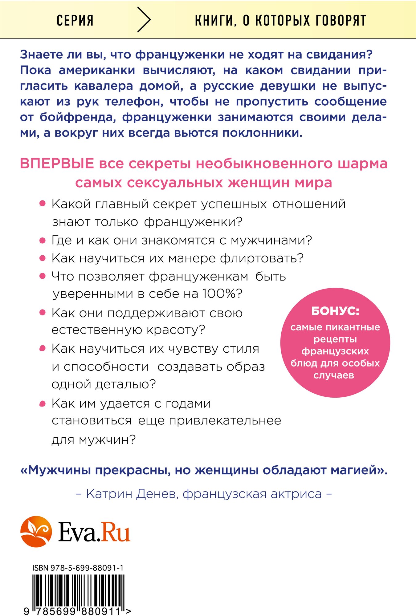 Книжка просто прелесть! Как разговор между подружками - обо всём понемногу. Автор сравнивает француженок и американок. Русским женщинам это тоже будет интересно. Книга читается легко, просто на одном дыхании. И как бы между прочим, между повествованием, находишь полезные советы, особенно в отношении мужчин. К этой книге замечательным дополнением будет художественный фильм "Бум" и "Бум-2", где бабушка и мама героини имели у мужчин бОльший успех, чем внучка. Также, как и в книге. Рекомендую! Будет весело!