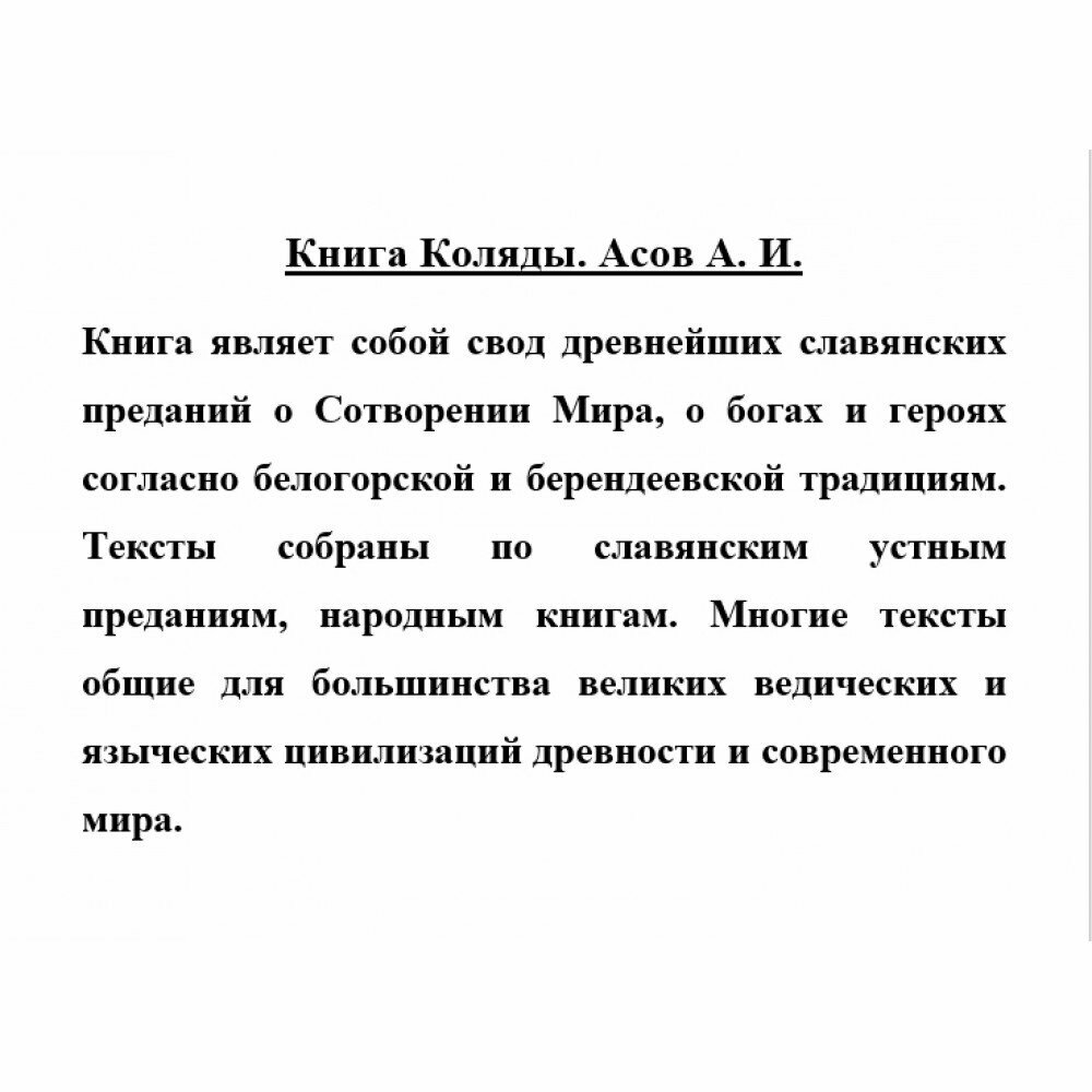 Книга специфичная, про нее нельзя сказать нравится или не нравится, потому что это не художественная литература, и подходит она для узкого круга лиц, интересующихся славянской культурой, ее зарождением, возникновением религии древних славян, кто такие древние славяне, какие постулаты и правила жизни были у славян. Книгу можно посоветовать тем, кто хочет разобраться, откуда взялись заповеди божьи, почему религии разных народов так похожи, откуда берет начало в том числе православная вера, откуда идут все православные молитвы, т.к. ведам 30 тысяч лет до нашей эры. В книге много черно-белых иллюстраций, исходных текстов.