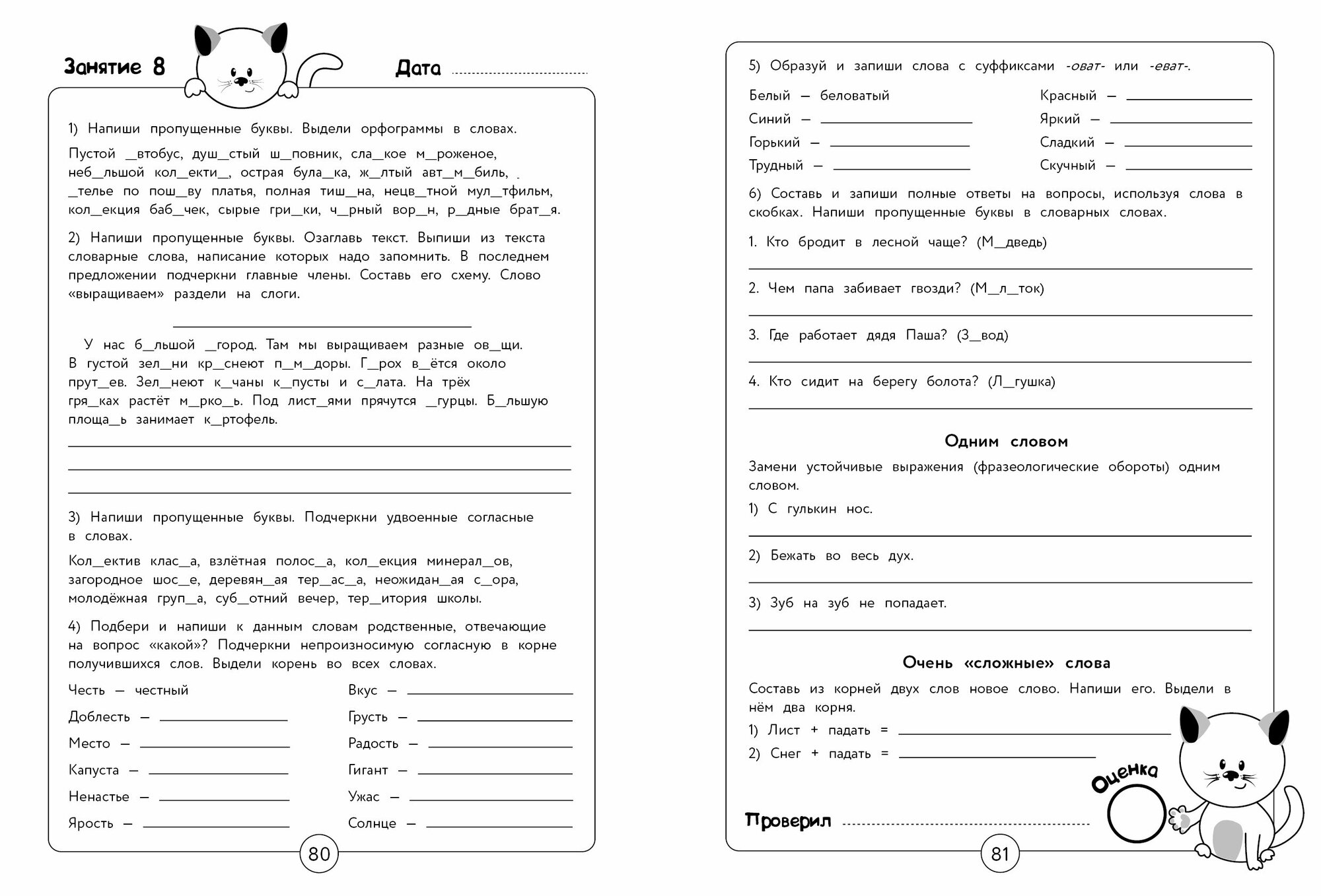 Тетрадь включает в себя 31 задание по математике и 31 задание по русскому языку по программе 2 класса. Задания пронумерованы, есть графа для указания даты, и место для оценки работы. Каждое задание на разворот тетради, по математике 4 упражнения включающие в себя примеры, задачи, вычисление площади и периметра и дополнительно задачи на сообразительность и числовые головоломки.