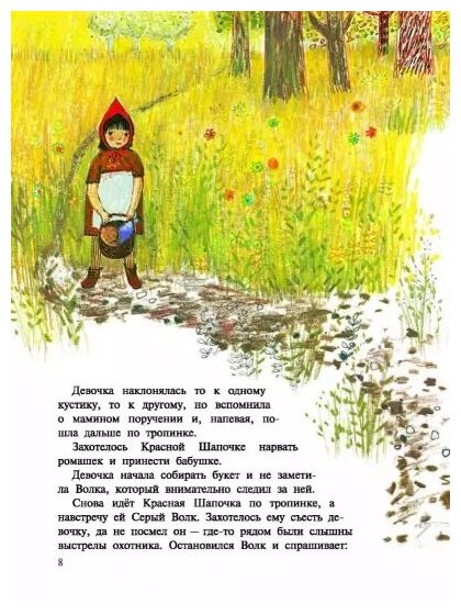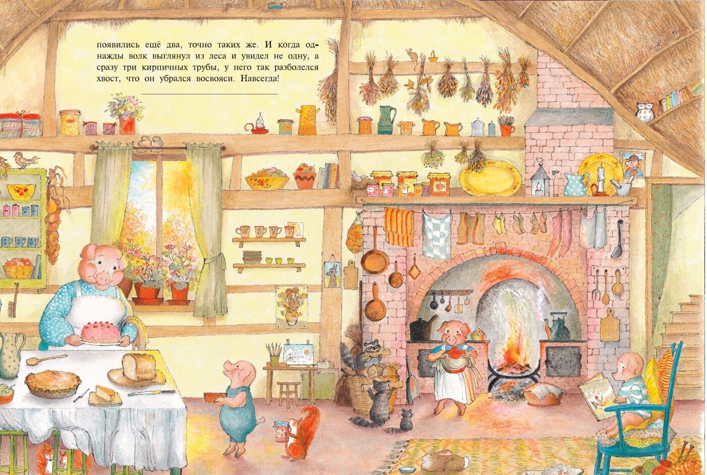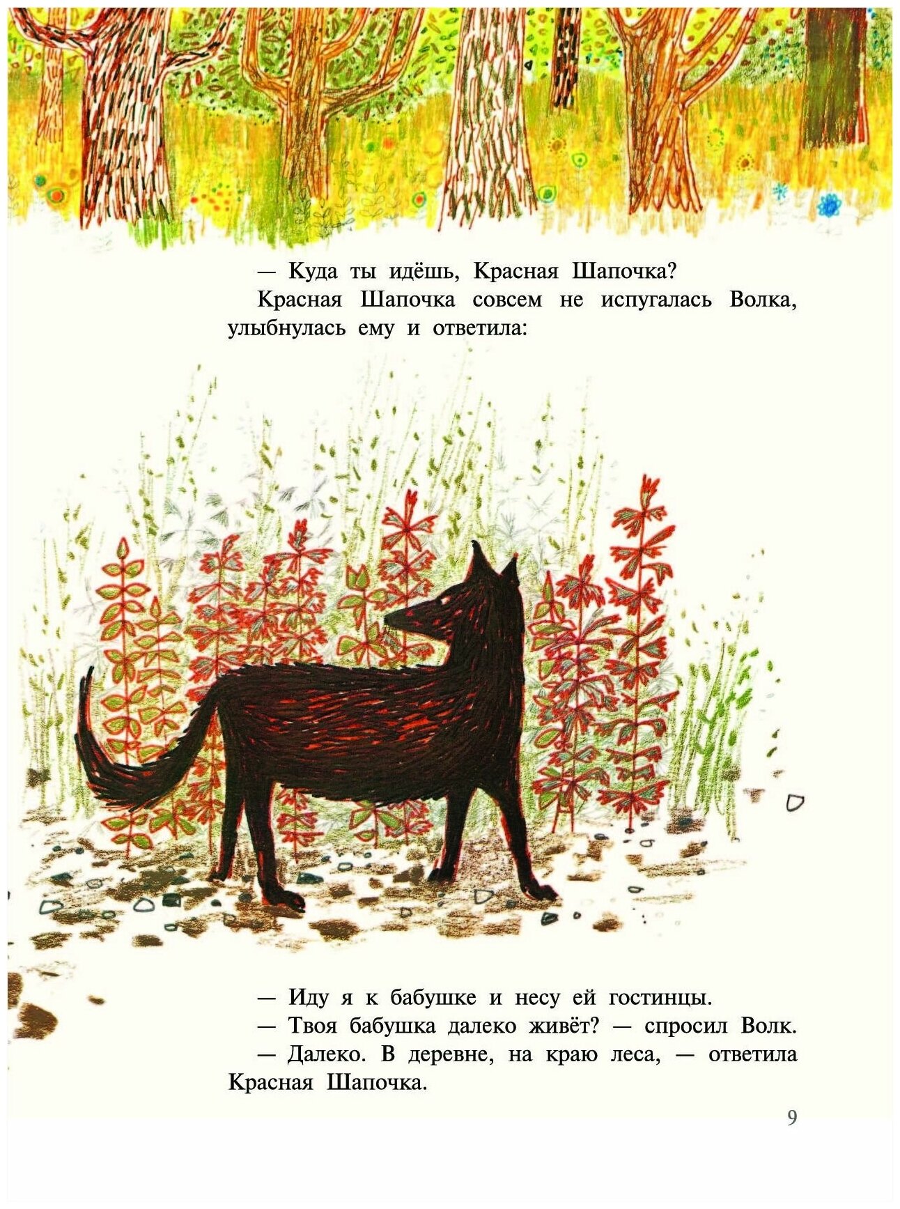 Например, на картинке нарисованы птички Золушки, а в тексте об этом нет речи. У волка зашито брюхо не просто так, наверное, в оригинале иллюстрация относится к варианту сказки, когда ему в брюхо кладут камни, а потом зашивают?