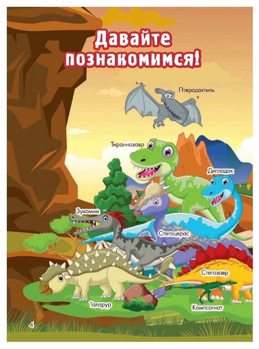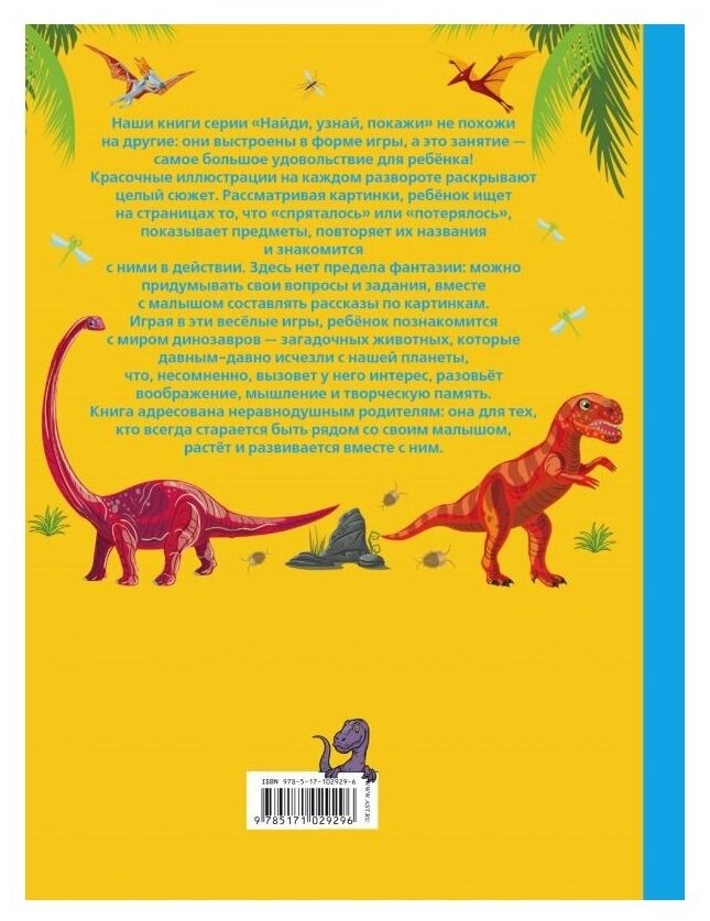 Вы держите в руках не просто книгу под названием "Динозавры". Это большая игра. Ведь именно в игре ребёнок знакомится с окружающим миром, развивает воображение, тренирует память, учиться размышлять и творчески подходить к решению разных задач. Каждый разворот издания полон красочных иллюстраций, логически объединённых одним сюжетом из жизни динозавров - удивительных животных, когда-то живших на нашей планете. Играя, ребёнок с лёгкостью запомнит непростые названия этих древних ящеров, узнает, чем они отличаются друг от друга, назовёт действия, которые они совершают, научится рассуждать и отвечать на вопросы. А если ему пока трудно найти что-то на странице - мама всегда поможет.