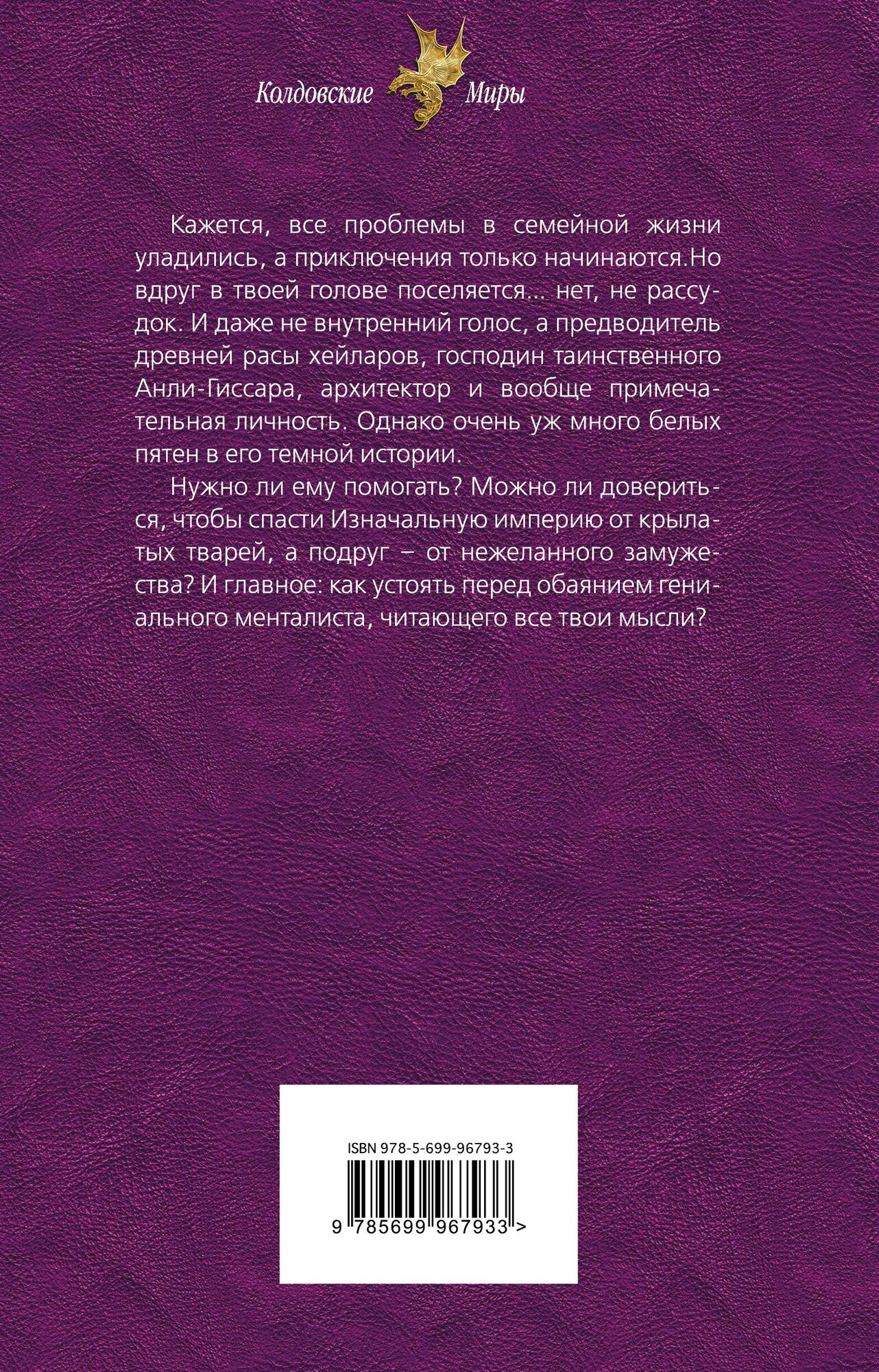 Кажется, все проблемы в семейной жизни уладились, а приключения только начинаются. Но вдруг в твоей голове поселяется... нет, не рассудок. И даже не внутренний голос, а предводитель древней расы хейларов, господин таинственного Анли-Гиссара, архитектор и вообще примечательная личность. Однако очень уж много белых пятен в его темной истории. Нужно ли ему помогать? Можно ли довериться, чтобы спасти Изначальную империю от крылатых тварей, а подруг - от нежеланного замужества? И главное: как устоять перед обаянием гениального менталиста, читающего все твои мысли?