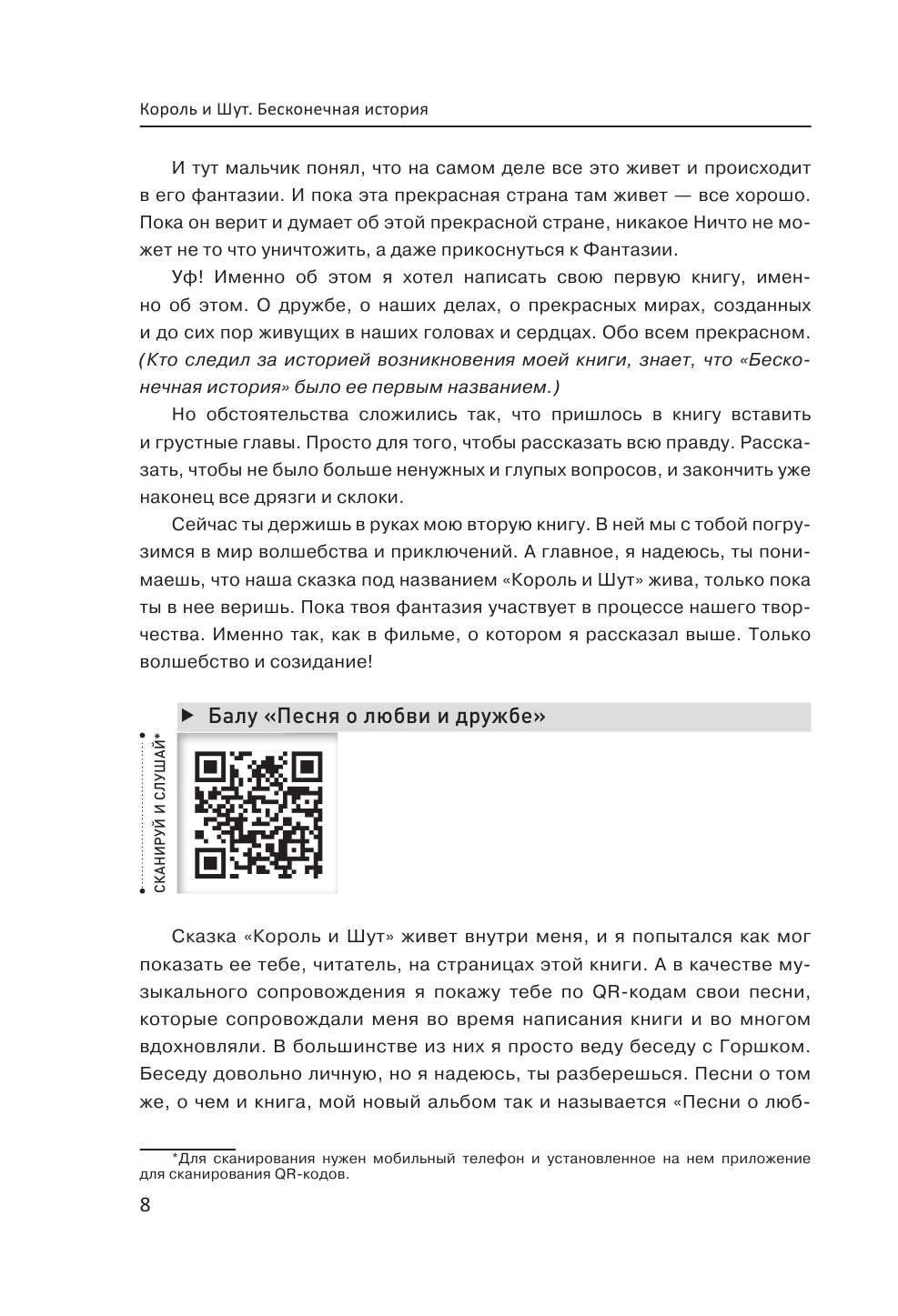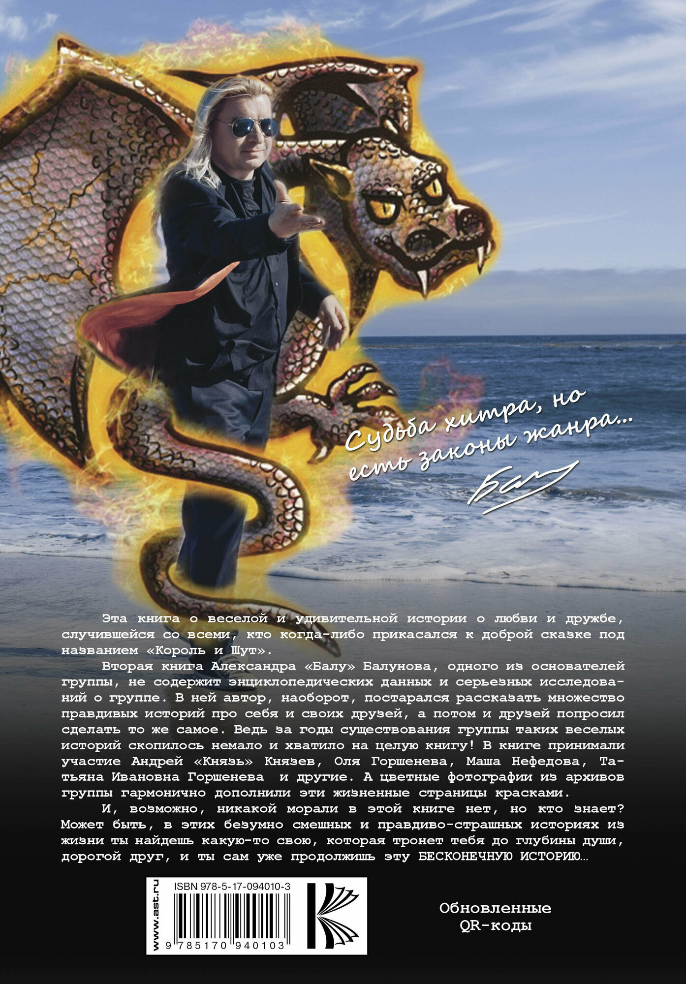 Эта книга о веселой и удивительной истории о любви и дружбе, случившейся со всеми, кто когда-либо прикасался к доброй сказке под названием "Король и Шут". Вторая книга Александра "Балу" Балунова, одного из основателей группы, не содержит энциклопедических данных и серьезных исследований о группе. В ней автор, наоборот, постарался рассказать множество правдивых историй про себя и своих друзей, а потом и друзей попросил сделать то же самое. Ведь за годы существования группы таких веселых историй скопилось немало и хватило на целую книгу! В книге принимали участие Андрей "Князь" Князев, Татьяна Ивановна Горшенева, Оля Горшенева, Маша Нефедова и другие. А цветные фотографии из архивов группы гармонично дополнили эти жизненные страницы красками. И, возможно, никакой морали в этой книге нет, но кто знает? Может быть, в этих безумно смешных и правдиво-страшных историях из жизни ты найдешь какую-то свою, которая тронет тебя до глубины души, дорогой друг, и ты сам уже продолжишь эту бесконечную историю…