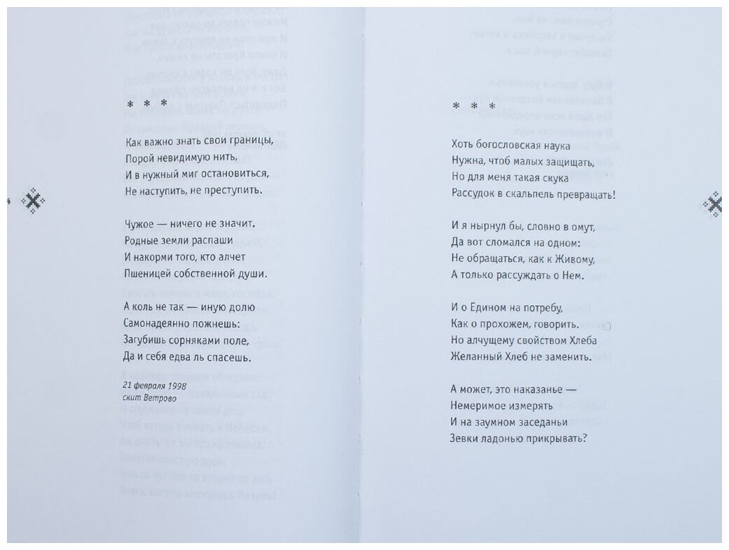 Сразу скажу, что я человек - не воцерковленный. Открыла для себя творчество этого удивительного и, на мой взгляд, достойного человека еще в начале 2000-х годов. Слушала его песни, а когда увидела сборники стихов поняла, что хочу иметь в своей библиотеке его книги, чтобы всегда были под рукой. И правда, периодически возвращаюсь к ним. Его стихи греют душу. Очень мелодичные, глубокие по содержанию, искренние и необыкновенно красивые. Не зря его сравнивают с Сергеем Есениным.