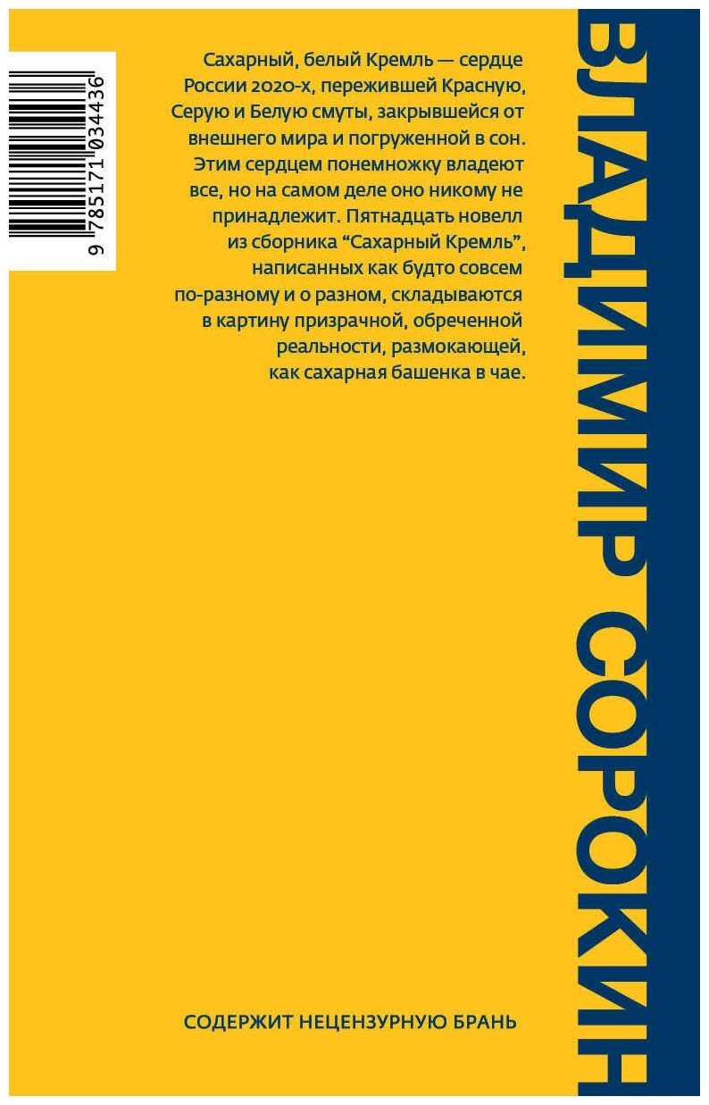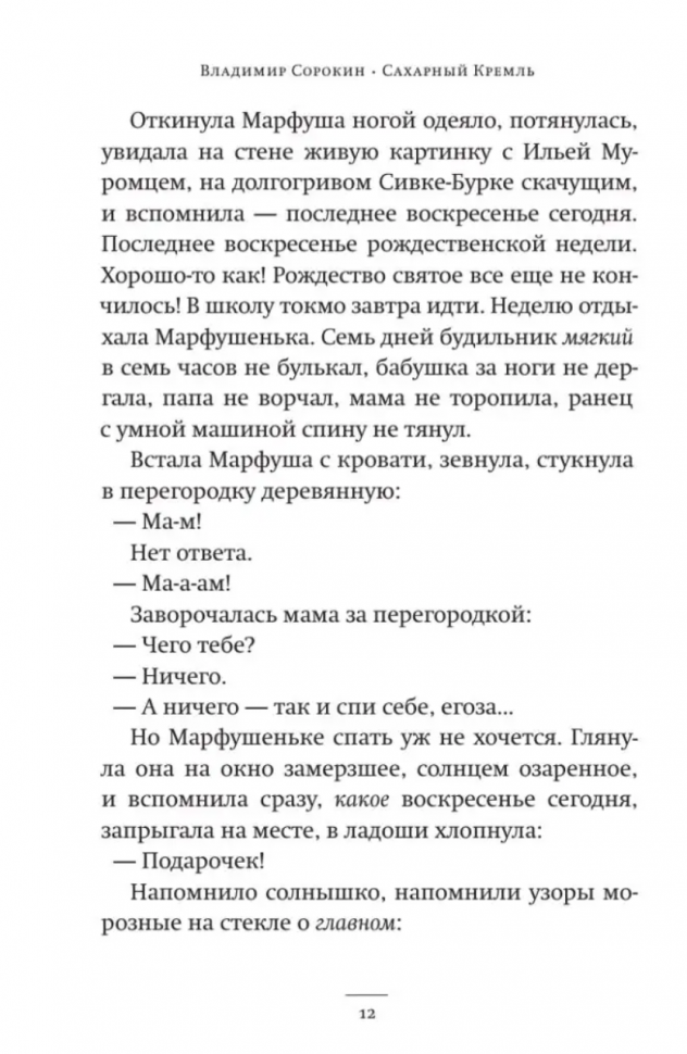 Это то, что можно назвать второй частью "Дня опричника". Набор рассказов ни как не связанных друг с другом ни сюжетом, ни персонажами. За исключением одной детали - в каждом фигурирует леденец-не-леденец, а фигурка Кремля из сахара. Чтои связывает все эти рассказы в повесть-мозайку. Время действия - через несколько лет после Дня опричника. И собственно все происходящее есть логическое следствие опричны этой. Правда есть нечто оптимистичное: кончается книга тем, что в России газ кончился.