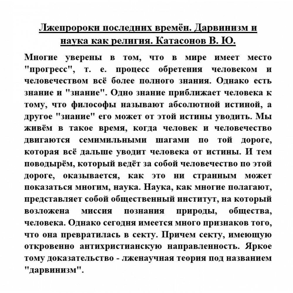 Многие уверены в том, что в мире имеет место "прогресс", т.е. процесс обретения человеком и человечеством всё более полного знания. Однако есть знание и "знание". Одно знание приближает человека к тому, что философы называют абсолютной истиной, а другое "знание" его может от этой истины уводить. Мы живём в такое время, когда человек и человечество двигаются семимильными шагами по той дороге, которая всё дальше уводит человека от истины. И тем поводырём, который ведёт за собой человечество по этой дороге, оказывается, как это ни странным может показаться многим, наука. Наука, как многие полагают, представляет собой общественный институт, на который возложена миссия познания природы, общества, человека. Однако сегодня имеется много признаков того, что она превратилась в секту. Причем секту, имеющую откровенно антихристианскую направленность. Яркое тому доказательство - лженаучная теория под названием "дарвинизм".