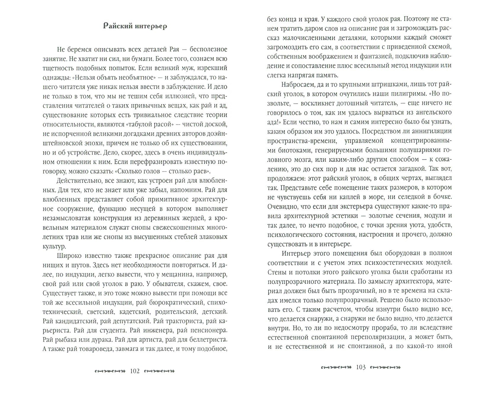 Картина мира в описании приключений героев книги сильно отличается от привычной для обывательского сознания. Согласитесь, что Черт, стоящий на страже Рая, и охраняющий Ад доморощенный философ - Ангел с его оригинальной классификацией грехов человеческих сильно расширяют наше привычное к классическим схемам сознание.