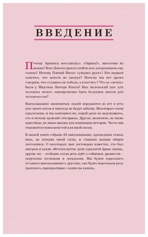 Иногда всего несколько слов способны изменить ход мировой истории, а одна меткая фраза может во всей полноте передать дух своей эпохи. Многие высказывания со временем становятся крылатыми, но далеко не всегда мы помним, когда, кем и при каких обстоятельствах они были сказаны. За каждой из 33-х собранных в этой книге фраз стоит целая история, полная драматических событий, взлётов и падений. Здесь есть место и легендам, и гипотезам, и достоверным фактам, которые мы попытаемся расставить по местам.