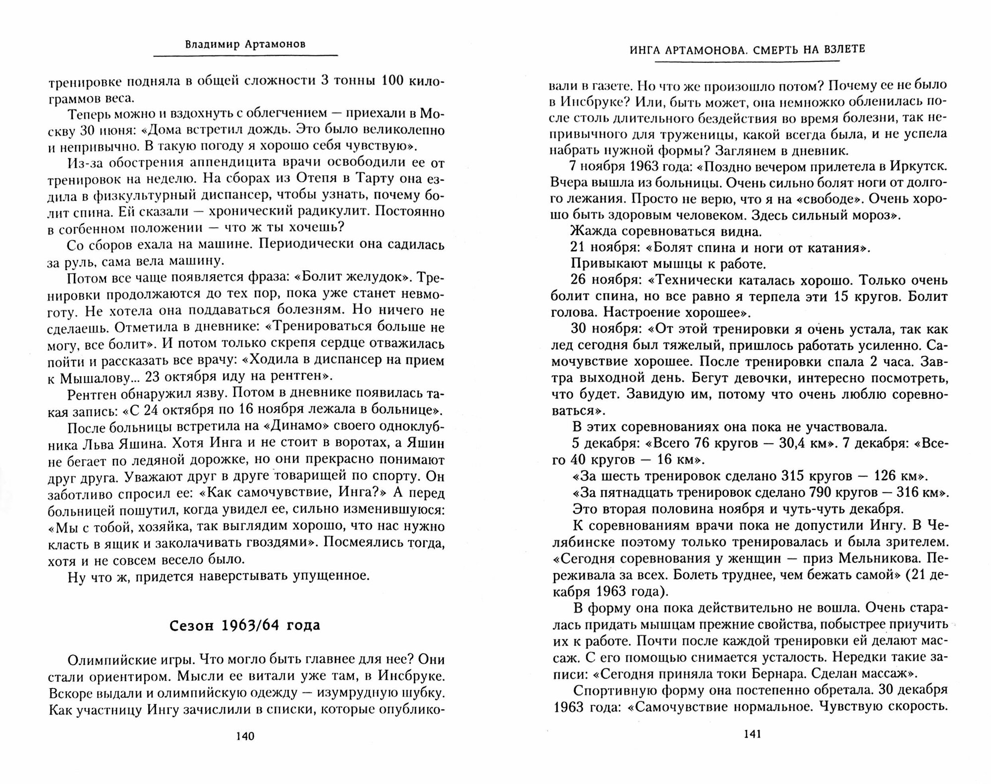 Инга Артамонова Смерть на взлете Яркая жизнь и трагическая гибель. Книга очень интересная, но немного сухая- автор ее, родной брат Инги, Владимир Артамонов, журналист, этим все сказано. Хотелось немного более подробных и ярких описаний - тем более у нее была яркая спортивная карьера( четырехкратная олимпийская чемпионка). За этим труд, годы занятий и тренировок, жертвы- она заболела туберкулезом, но тем не менее еще раз стала чемпионкой мира. Предствляете. как это сложно? История ее смерти вообще ужасная. Сейчас уже мало кто помнит про это, но вот моя бабушка например читала и они как раз обсуждали, я собственно ей и купила эту книгу. Сама прочитала с огромным интересом. даже в интернете полазила, выяснила, что в советское время тоже была книга про неё, истоия очень известная и спортсменка легендарная, просто когда всё случилось, еще и мамы моей не было.