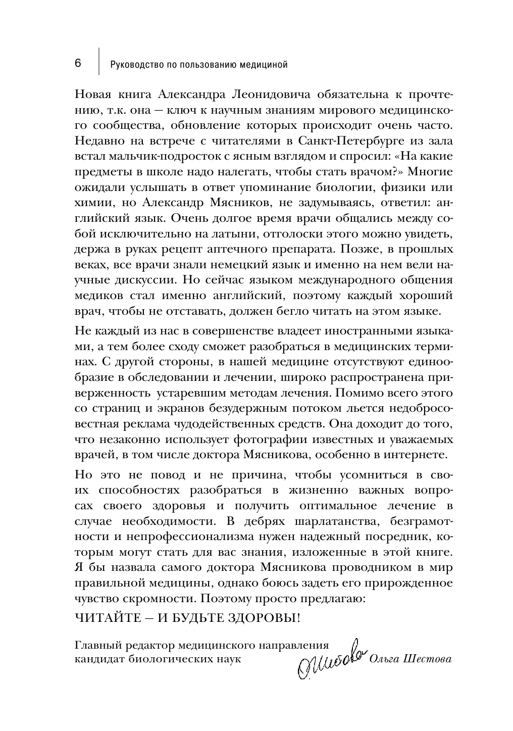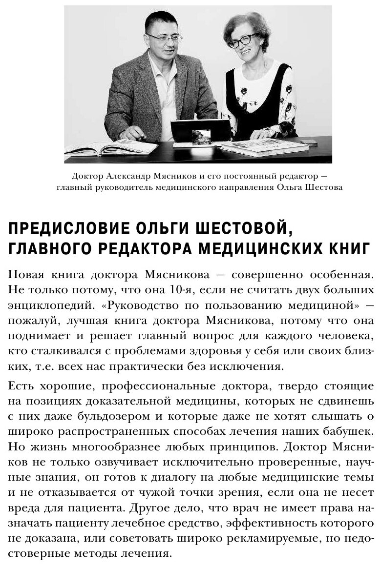 Новая книга доктора Мясникова - совершенно особенная. Она поднимает и решает главный вопрос для каждого, кто сталкивался с проблемами здоровья: своего или своих близких. В нашей медицине отсутствует единообразие в обследовании и диагностике, широко распространена приверженность устаревшим методам лечения. Кроме того, со страниц и экранов безудержным потоком льется недобросовестная реклама чудодейственных средств, признанных в мировой медицине неэффективными.