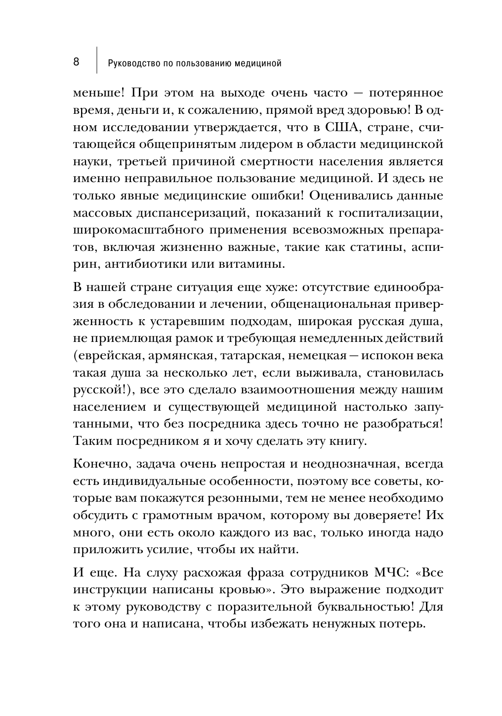 Автору, Бравооо!!!!!! Очень многие фрагменты из этой книги я зачитывала мужу в слух, обычно он равнодушен к таким книгам, а тут с интересом слушал. Не мало тех, кто не хочет/ не любит читать про болезни и здоровье, обходят эти темы стороною, но эта книга про медицину, что за зверь, в каких условиях живет и чем питается, поэтому она будет хорошим пособием каждому, кто допускает мысль, что он сталкнется с медициной, даже в полном здравии. Да и у каждого есть близкие люди, которые не безразличны, и у которых не богатырское здоровье, чтобы не знать кто такой врач и медицина, а прочитав эту книгу можно будет правильно и грамотно позаботиться если не о себе, то о близких и не только в России, но и в Европе и Америке. Сэкономить деньги и время на ненужные лекарства и процедуры. Очень смеялась, и думала, вот это в точку, когда читала, как выглядит наш пациент, что он думает, во что верит и чего боится, как действует, очень точно отображено :-)))), и вспоминала своих близких, как в точку автор попал....,и поразила история про излечение ноги от язв супруги Александра в храме Тибета. -