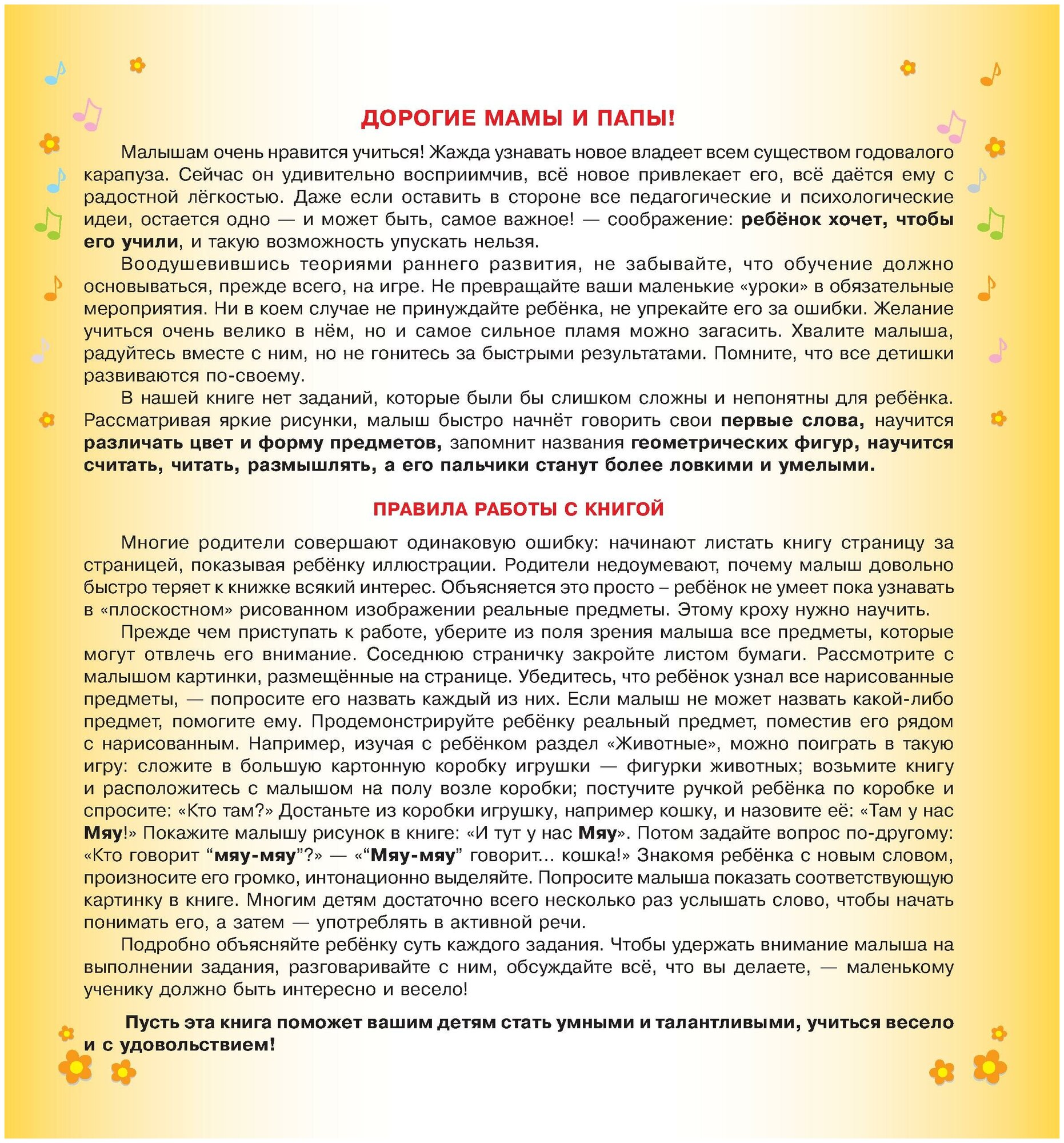 Книга замечательная! Моей дочке 2 года. Нам очень нравится рассматривать ее и выполнять несложные задания. Например, лепить из пластелина цифры и буквы. Дочька быстро запоминает))) В книге, действительно, собрано все, что должен знать малыш: цвета, цифры, буквы, формы, овощи, фрукты, транспорт ....