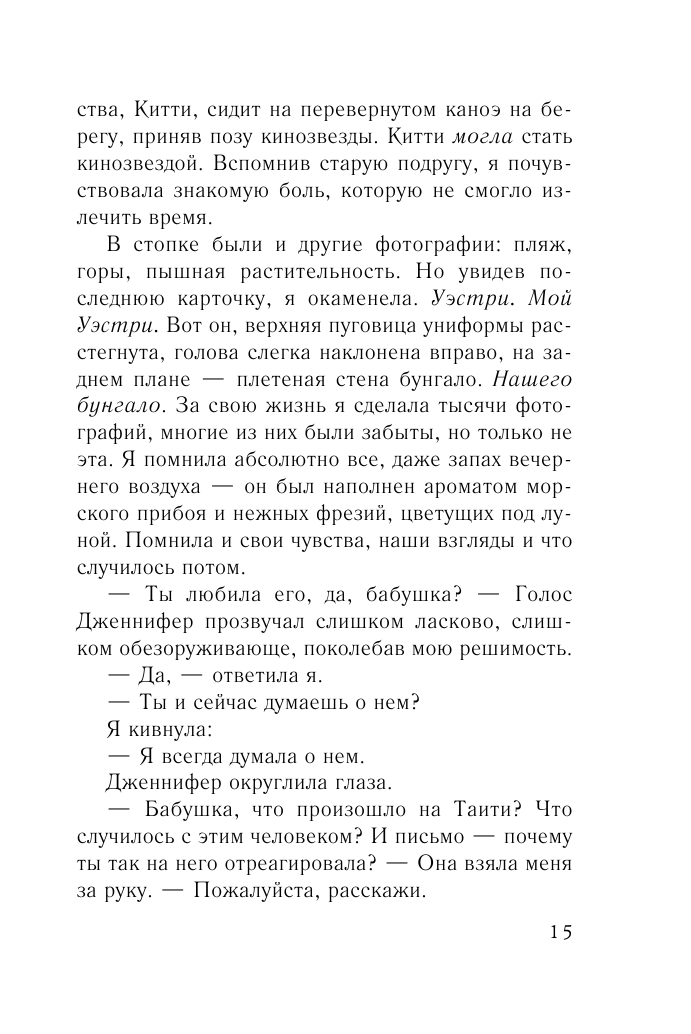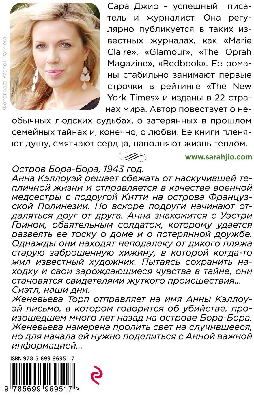 После данной книги Сары Джио, я стала щелкать ее романы, словно семечки. Интересные, трогательные, ненавязчивые, легкие для прочтения, создающие приятную атмосферу и настроение. Не сказала бы, что книги данного автора можно отнести к шедеврам литературы, но хорошо провести вечер за интересным чтением, они вам гарантируют. Сюжеты немного однотипные: переплетение настоящего с прошлым, в основном 30-е годы; любовь; нотки детектива. Но несмотря на эту однотипность, сюжет быстро захватывает и хочется скорее узнать развязку. Здесь мы отправляемся в военные годы на прекрасный райский остров Бора-Бора, на котором развиваются романтические отношения главной героини, но вместе с тем рушатся отношения с лучшей подругой.На острове происходит много разных событий, тайны которых раскрываются только спустя много лет... Любителям таинственных романтических историй обязательно рекомендую к прочтению!