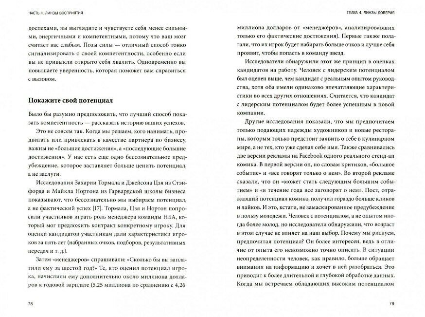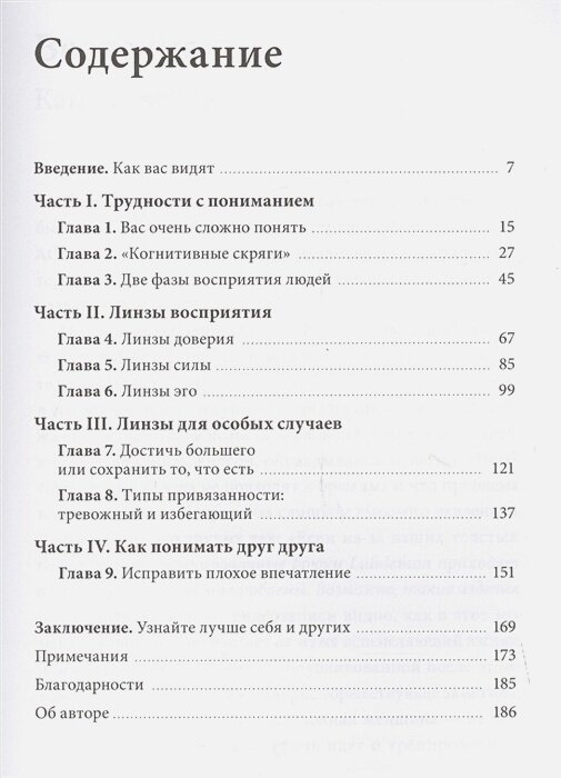 Прочитал и остался доволен этой книгой. Здесь поэтапно разобран процесс восприятия одного человека другим, показаны основные моменты, которые формируют мнение (впечатление) о человеке, стереотипы и ловушки восприятия. Исходя из этих данных, на мой взгляд, вполне возможно научиться (или отточить своё умение) доносить информацию о себе правильно и без ошибок, а также более корректно воспринимать окружающих. Поставленную задачу автор выполняет на оценку «хорошо», множество примеров психологических экспериментов в подтверждение сказанного, читается весьма живо и интересно. Большой плюс данной книги, что она опираясь на известных фактах (в т.ч. из книг Гилберта, Канемана, Майерса и пр.), концентрируется на узкой, конкретной теме и честно старается раскрыть эту тему максимально. Рекомендую к прочтению!