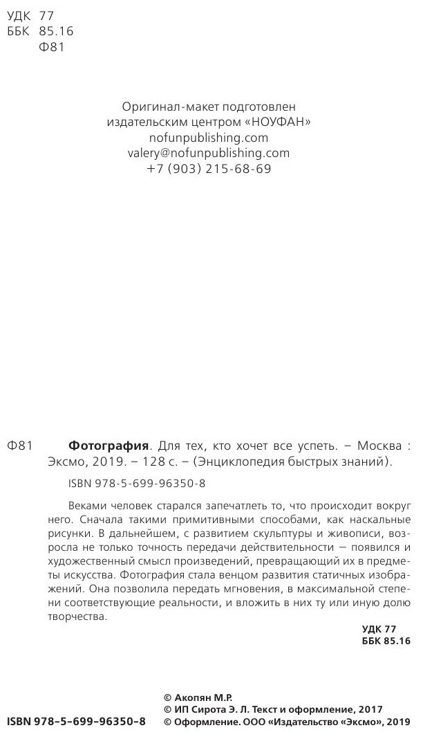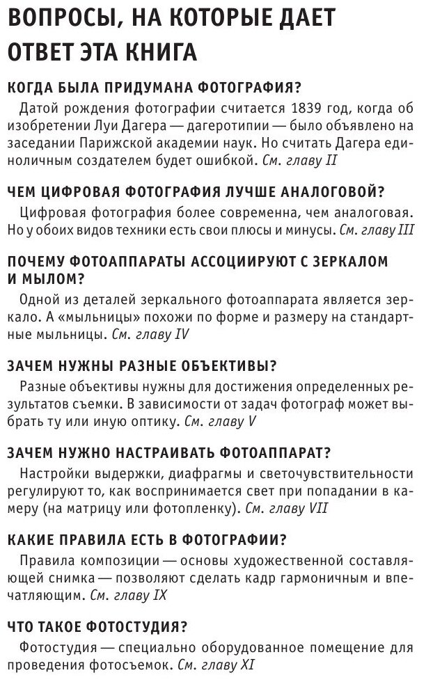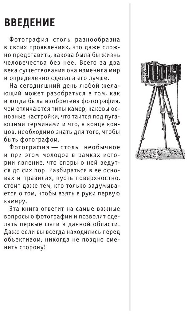 Очень понравилась серия таких энциклопедий. Все написано доступно и только главное. Подходит для Российских читателей, что ни где-то там за рубежом, а то что сейчас в России. Написаны только базовые знания, хорошо как для начинающих (понять суть фотографии), так и для опытных (освежить знания).
