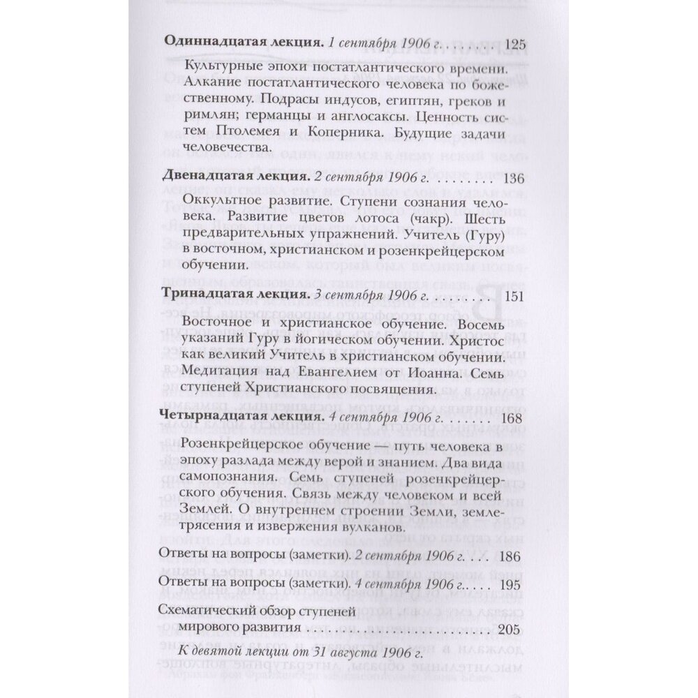 Большое место уделено также вопросам строения и развития Земли - планетарным состояниям и культурно-историческим эпохам, а также сравнительному анализу восточной, религиозно-христианской и розенкрейцерской школ оккультного развития, упражнениям и ступеням посвящения.