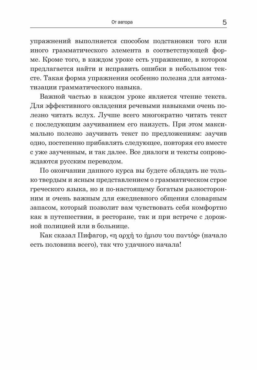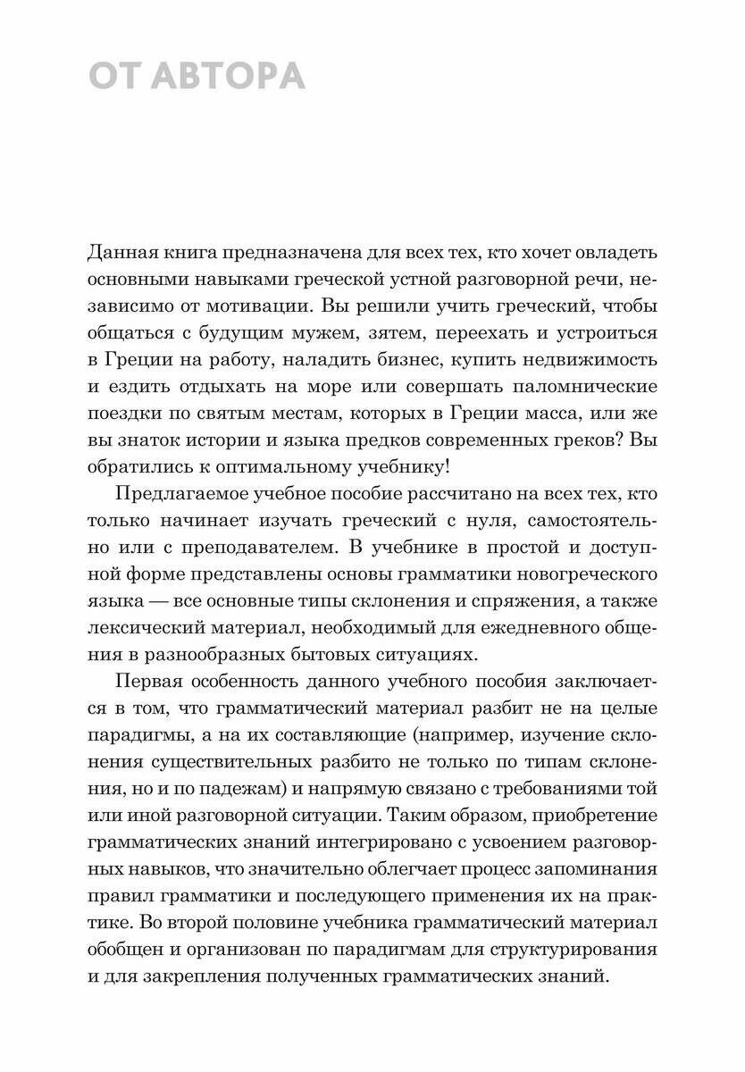 Предлагаемое учебное пособие адресовано тем, кто хочет овладеть навыками разговорной речи на греческом языке и только приступает к занятиям с преподавателем или к самостоятельному изучению языка. В книге в простой и доступной форме представлены основы грамматики новогреческого языка - все типы спряжений и склонений, а также лексический материал, необходимый для ежедневного общения в разнообразных бытовых ситуациях.