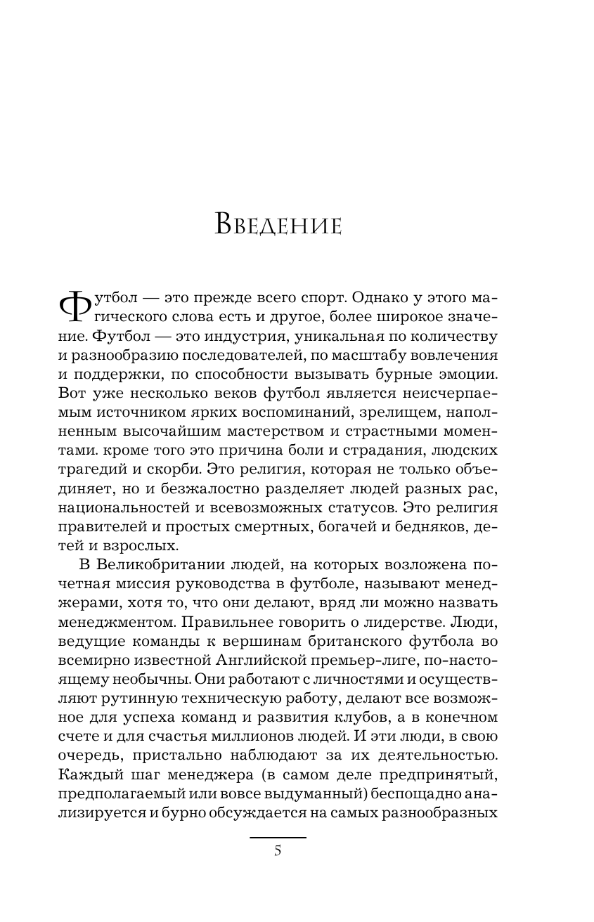 Впервые в истории 30 самых успешных футбольных менеджеров раскрывают секреты лидерства. Это тренеры и руководители, за успехами и неудачами которых следят миллионы болельщиков. На страницах книги вы узнаете, какова цена триумфальных побед, как принимать непопулярные и тяжелые решения, как сохранить веру и вести команду к вершинам, несмотря на поражения. Эта книга для тех, кто влюблен в футбол и хочет разобраться, по каким правилам и законам устроена эта самая популярная в мире индустрия.