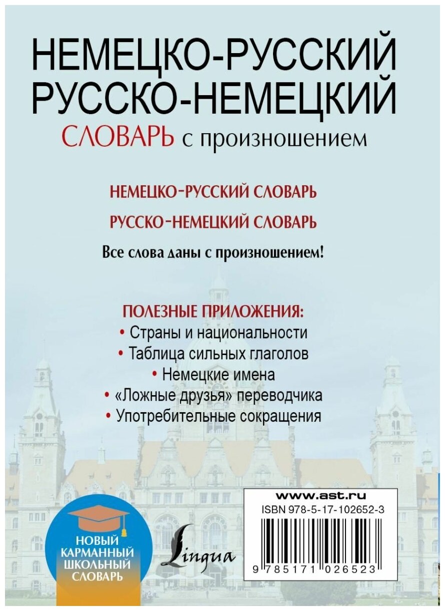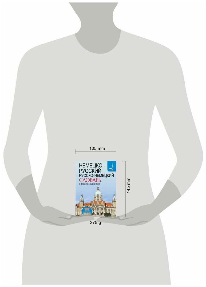 Русско - немецкий словарь с произношением и транскрипцией. В нем содержится восемь тысяч слов, а также в конце словаря даются таблицы с глаголами определённой формы. Словарь очень удобный, и портативный: в кармане его комфортно носить, а в рюкзаке он вовсе не ощущается. Дизайн словаря весьма презентабельный.