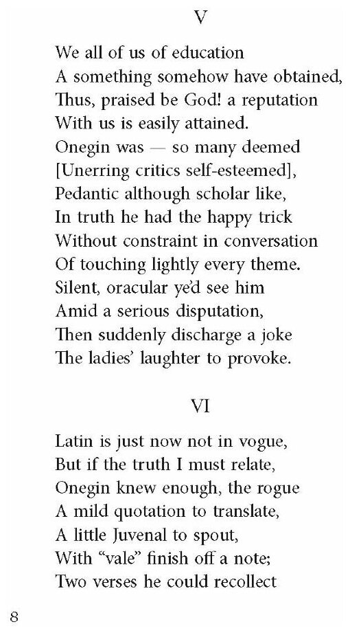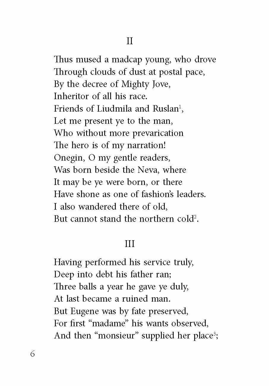 Предлагаем вниманию читателей роман в стихах А. С. Пушкина "Евгений Онегин", одно из самых значительных произведений русской литературы. Критик В. Г. Белинский назвал его "энциклопедией русской жизни". Переводчик Г. Сполдинг составил подробный комментарий реалий русской жизни.