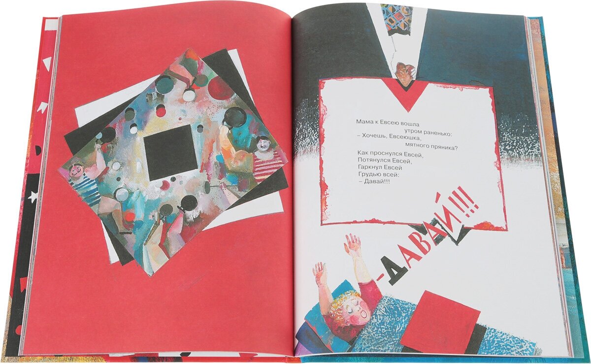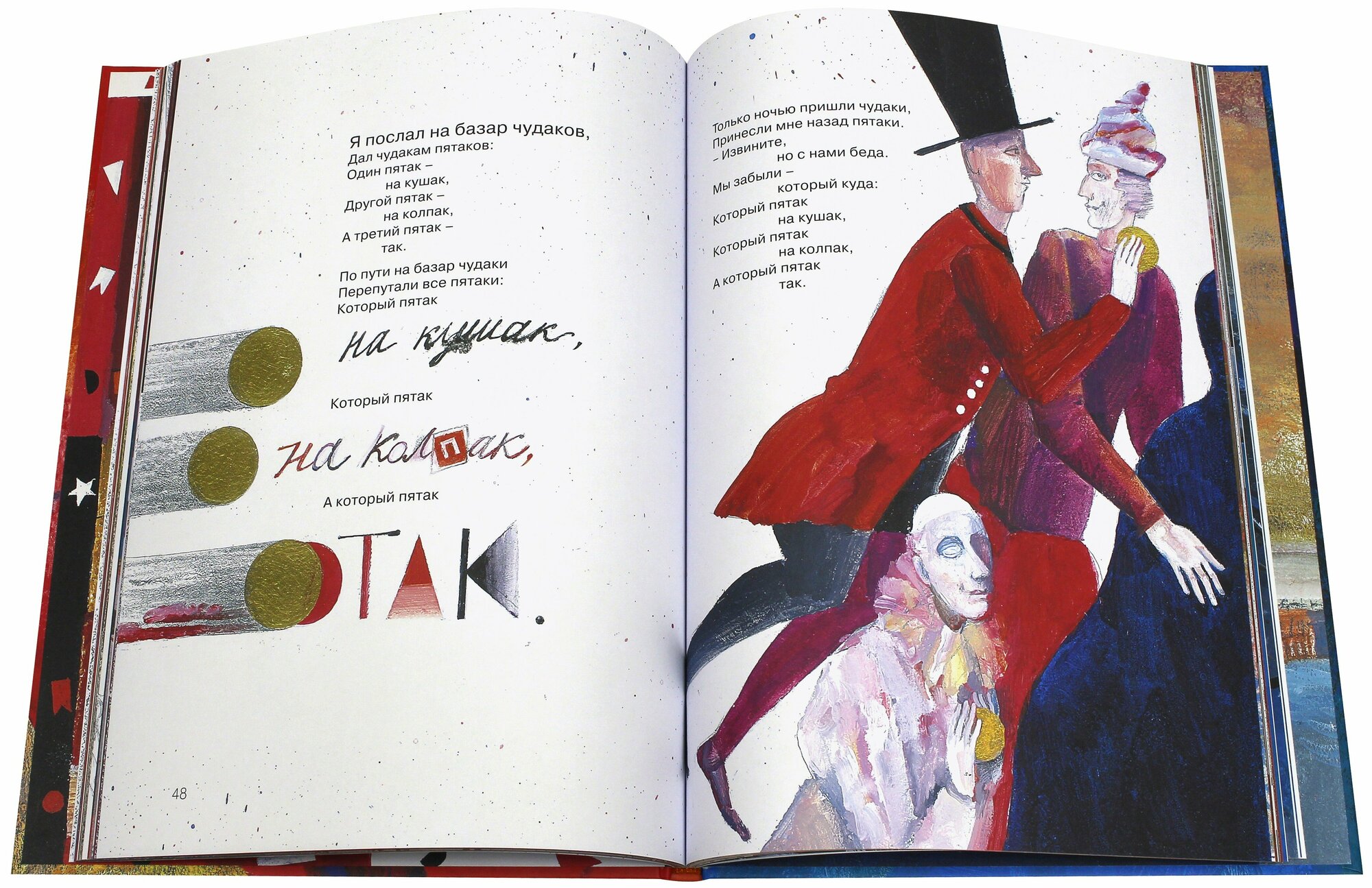 Книга очень стильная. Я бы сказала даже, что это скорее произведение изобразительного искусства, нежели литературного, поскольку иллюстраций в книге куда больше, чем собственно текста. Иллюстрации на весь разворот. И на целый разворот 6-10-20 строчек текста стихотворения. Есть развороты вообще без текста. Я насчитала таких целых 12. В части, содержащей рассказы 2 разворота практически без иллюстраций. Но сами рассказы занимаюсь всего 5 разворотов. Я бы сказала иллюстрации совсем не детские, все в одном стиле, на любителя. Стихи неплохие. Но кое-что морально устарело "управдом", "красноармейцы", "шарабан". Получается, что несмотря на то, что в книге 96 страниц, читать-то почти и нечего. Полагаю, можно было сделать книгу более бюджетной сократив объем без всякого ущерба содержанию.