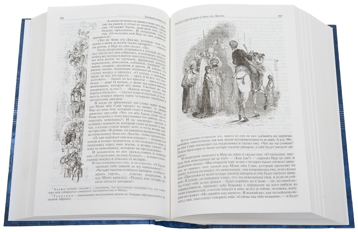Но есть-то нормальные переводы. И даже один просто чудесный. Это Иосиф Брояка и Лидия Петрова, поэтические переводы Александр Ревич. Изд-во МП "Лаванда" Киев 1994 год, в 12 книгах, 10 томов. Собирала по всем книжным магазинам и развалам по 1-2 тома. Но переводили они (в предисловии написали) прямо с арабского. Иллюстрации - репродукции с подлинных арабских миниатюр. Очень рада, что наши литераторы "корректируют" этого пошлого Салье, но всё равно всем рекомендую настоящий перевод, тем более, что можно читать и взрослым и детям. -