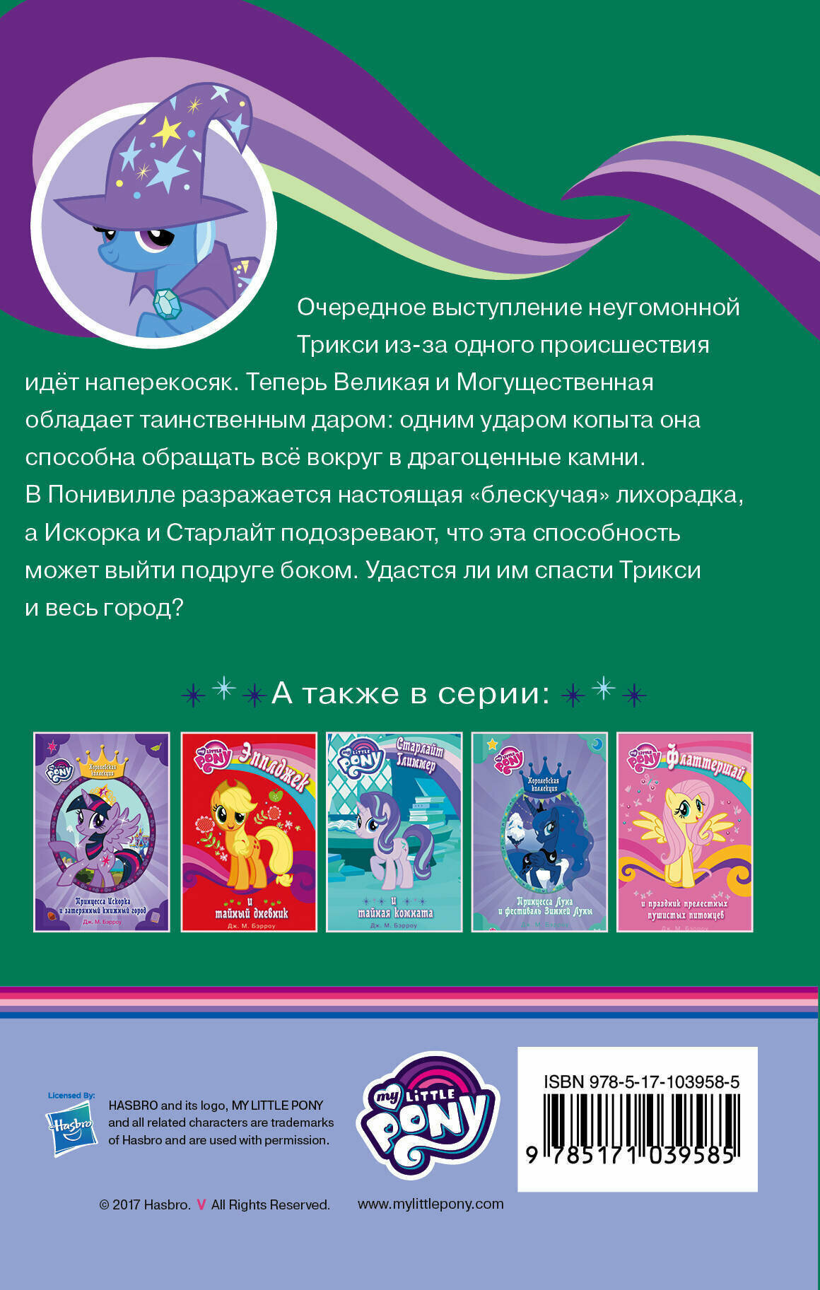 У нас несколько книг из серии, эта - самая любимая, хотя тут в главных ролях не главные шесть пони, а Трикси и Старлайт Глиммер. Остальные пони появляются уже во второй половине, когда Трикси надо спасать: у неё не только копыто становится волшебным, она вся может постепенно превратиться в драгоценный камень. Дочка даже перечитывала, что с ней случается не очень часто.