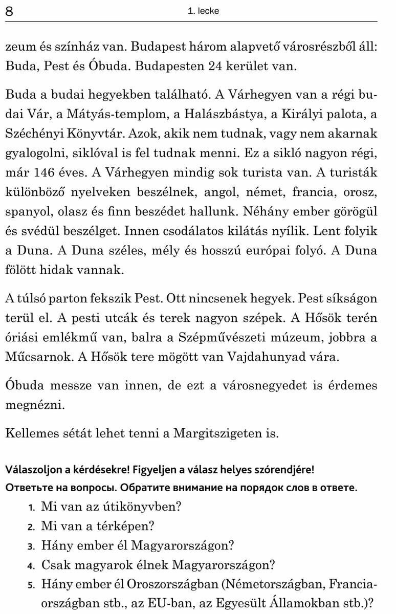 Этому пособию плюс за компоновку урока. Для развития и закрепления коммуникативного навыка оно будет очень полезно. Я придерживаюсь мнения, что изучать язык в отрыве от истории и культуры не так продуктивно, как в сочетании со страноведением, и здесь пособие снова хорошо себя проявляет: пословицы, поговорки, анекдоты и рассказы об особенностях венгерских городов погружают в культуру страны изучаемого языка.