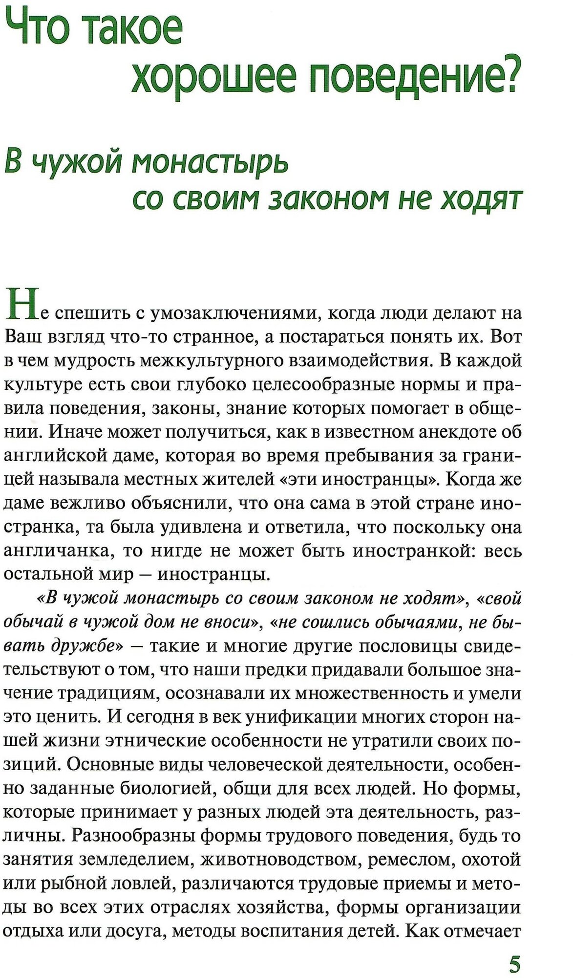 Часто приходится слышать, что народные традиции исчезли из жизни, теперь их место лишь на карнавалах и в инсценировках. Но отчего же, приехав в другой край или другую страну, вы замечаете, что люди временами ведут себя не так, как принято у вас на Родине? Почему, придя в гости, обнаруживаете, что хозяйка угощает вас непривычными блюдами? Почему кому-то нравятся одни песни, а кто-то поет совсем другие? Как объяснить то, что интерьер новых по архитектуре домов соседей имеет отличия от вашего жилья? Значит, все-таки мы по-прежнему очень разные?! И понять друг друга бывает непросто. Мудрость межкультурного общения заключается в том, чтобы не спешить с умозаключениями, когда люди делают на ваш взгляд что-то странное, а постараться их понять. В каждой культуре есть свои законы, свои нормы и правила поведения, знать которые интересно и полезно. Автор с позиции этнографа в занимательной форме рассказывает об особенностях этикета в разных уголках земного шара. Книга не только для старшеклассников, ее будет интересно прочитать и взрослым.