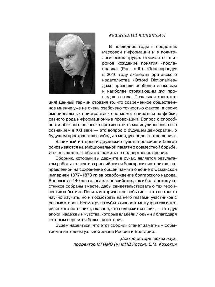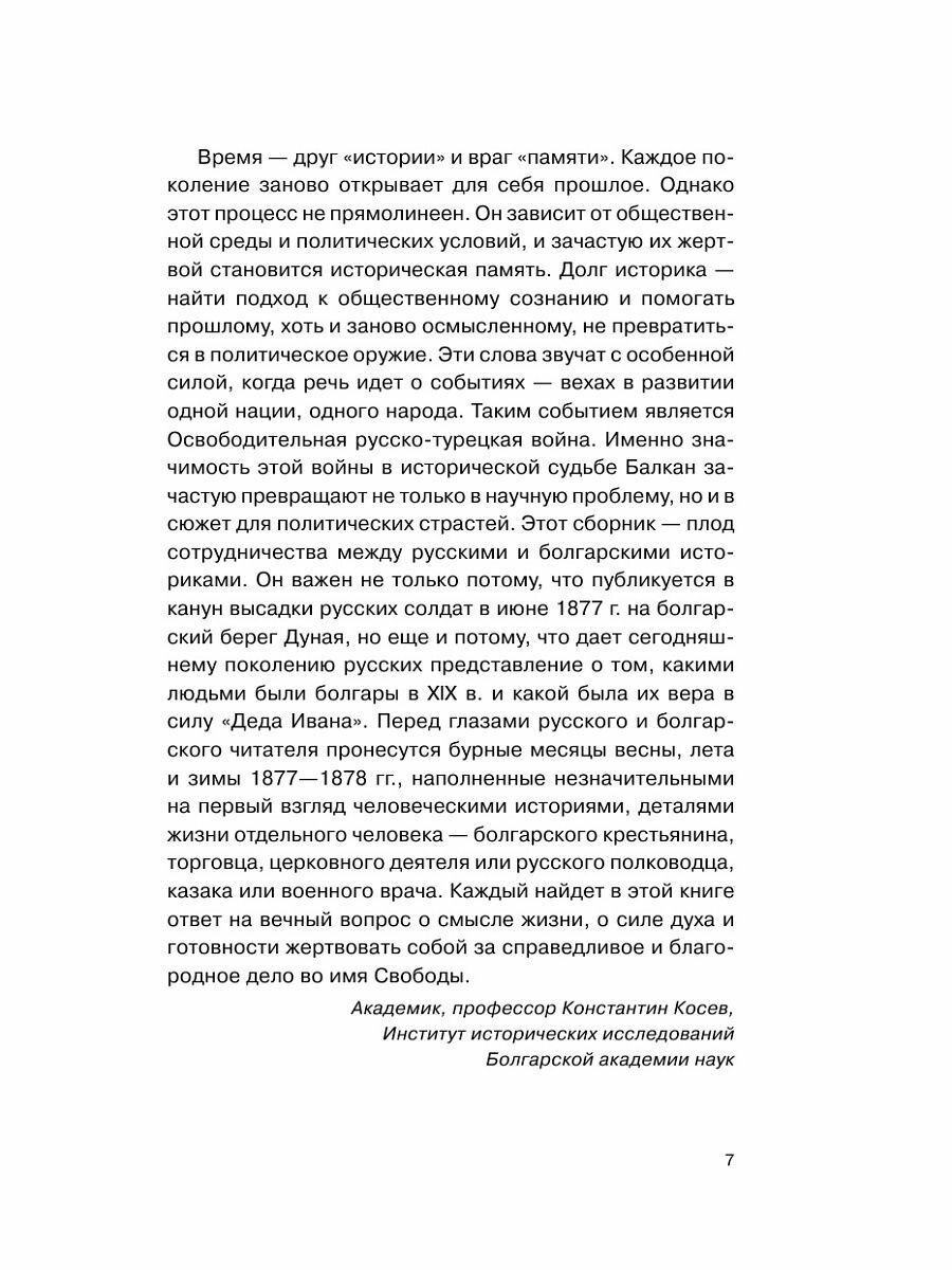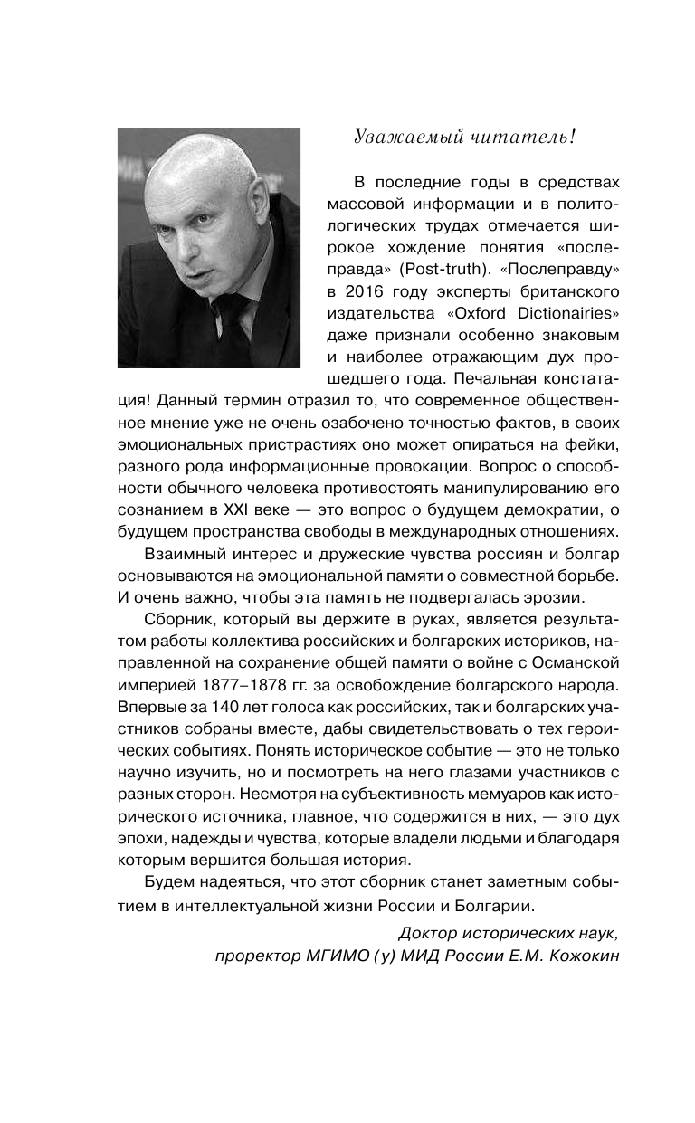 Из множества русско-турецких конфликтов освободительная война 1877-1878 годов достойна пристального интереса. Здорово, что сотрудники Российского военно-исторического общества инициировали совместный проект с болгарской стороной: так и перечень доступных источников стал шире, и интересы обеих стран в равной степени учтены. На страницах книги перед нами пронесутся бурные события весны, лета, зимы 1877-1878 гг., наполненные реальными судьбами, деталями жизни отдельного человека: болгарского крестьянина, торговца, церковного деятеля, русского командующего, казака или военного врача. На страницах книги каждый найдет ответ на вечные вопросы о смысле жизни, силе духа, готовности жертвовать собой за справедливое дело свободы. Книга построена на мемуарах. Они, конечно, субъективны, но максимально честно передают дух эпохи, надежды и чувства, которыми владели люди, благодаря чему вершилась большая история. События 1877-78 гг. нашли свое отражение в "Баязете" Валентина Пикуля и "Турецком гамбите" Бориса Акунина, в эпилоге "Анны Карениной" Л.Н. Толстого; добровольцами на войну уехали врачи Пирогов, Боткин, Склифосовский, а И.С. Тургенев говорил: «Будь я моложе, я сам бы туда поехал». Нам никуда ехать не нужно: живая история в словах современников событий предстает перед читателем, как и 140 лет назад.