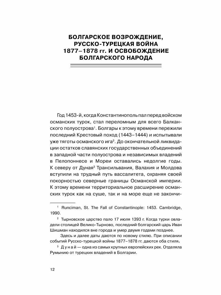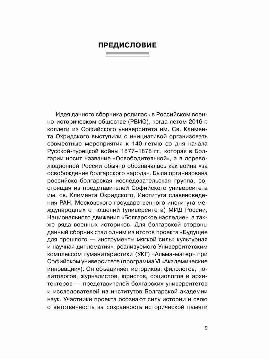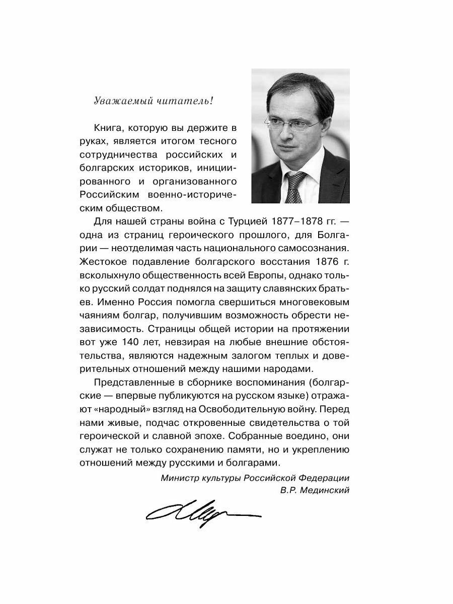 Из множества русско-турецких конфликтов освободительная война 1877-1878 годов достойна пристального интереса. Здорово, что сотрудники Российского военно-исторического общества инициировали совместный проект с болгарской стороной: так и перечень доступных источников стал шире, и интересы обеих стран в равной степени учтены. На страницах книги перед нами пронесутся бурные события весны, лета, зимы 1877-1878 гг., наполненные реальными судьбами, деталями жизни отдельного человека: болгарского крестьянина, торговца, церковного деятеля, русского командующего, казака или военного врача. На страницах книги каждый найдет ответ на вечные вопросы о смысле жизни, силе духа, готовности жертвовать собой за справедливое дело свободы. Книга построена на мемуарах. Они, конечно, субъективны, но максимально честно передают дух эпохи, надежды и чувства, которыми владели люди, благодаря чему вершилась большая история. События 1877-78 гг. нашли свое отражение в "Баязете" Валентина Пикуля и "Турецком гамбите" Бориса Акунина, в эпилоге "Анны Карениной" Л.Н. Толстого; добровольцами на войну уехали врачи Пирогов, Боткин, Склифосовский, а И.С. Тургенев говорил: «Будь я моложе, я сам бы туда поехал». Нам никуда ехать не нужно: живая история в словах современников событий предстает перед читателем, как и 140 лет назад.