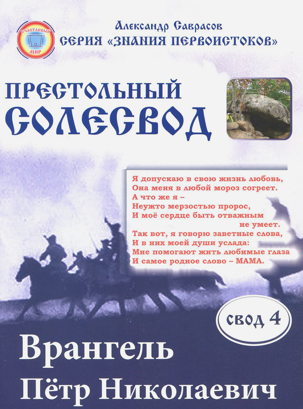 Купила четвёртый Солесвод Александра Саврасова. Информация в издании передаётся от дольменов 10-15-тысячелетней давности через автора. И также автор пообщался с фантомом Петра Николаевича Врангеля, который поведал, чем явилась для людей начала 20 века революция 1917 года, гражданская война, о чём мечтал белый генерал, какие серьезные у него сведения/знания были от контрразведчиков-друзей. Про город Петроград, какую тайную символику он несёт. И также в Солесводе анализ столетнего периода от Октябрьской революции до сегодняшнего дня, анализ сегодняшнего дня и нужна ли вообще была та революция и нужна ли новая революция. Ответы на вопросы читателей от духов Дольменов Геленджика по темам - как же сделать так, чтобы Земля-Матушка стала счастливой, как вырастить детей, чтобы наше будущее не погибло, не пропало, и что надо делать, чтобы быть счастливым.