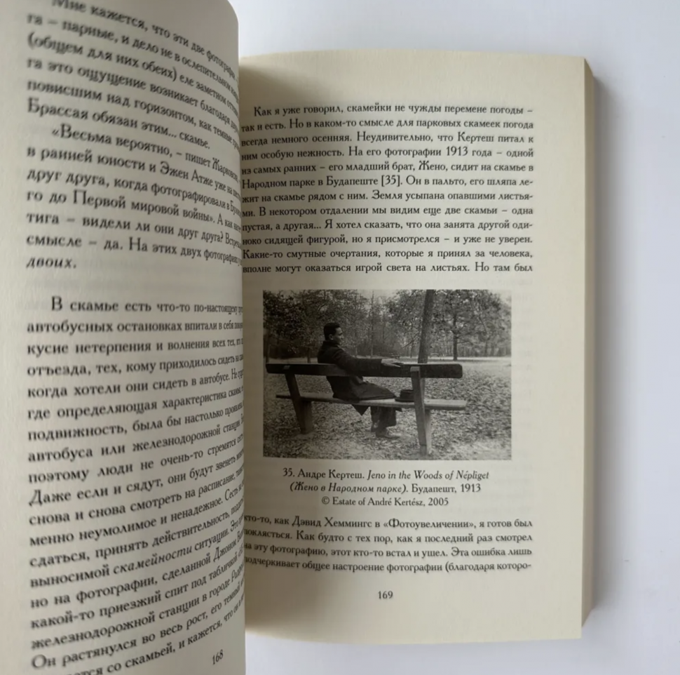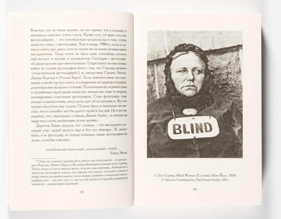 В книге приведено немало поэтических цитат, и это не случайно. Дайер изучает фотографии и обнаруживающиеся в них сквозные мотивы с дотошностью, достойной профессора литературоведения. Он находит тончайшие аллюзии и, кропотливо распутывая клубок, в который они неминуемо сплетаются, переходит от одного кадра к другому, от одного сюжета к другому. От "слепых музыкантов" к "ночным городам", от "рук" к "шляпам".