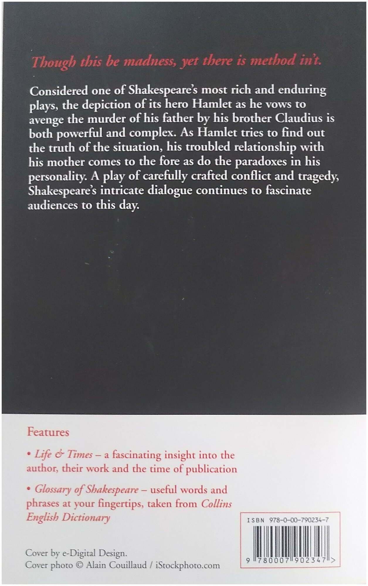 HarperCollins is proud to present its new range of best-loved, essential classics. 'Though this be madness, yet there is method in't.' Considered one of Shakespeare's most rich and enduring plays, the depiction of its hero Hamlet as he vows to avenge the murder of his father by his brother Claudius is both powerful and complex. As Hamlet tries to find out the truth of the situation, his troubled relationship with his mother comes to the fore, as do the paradoxes in his personality. A play of carefully crafted conflict and tragedy, Shakespeare's intricate dialogue continues to fascinate audiences to this day.