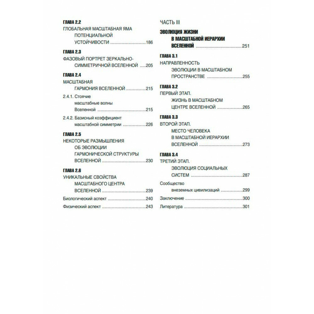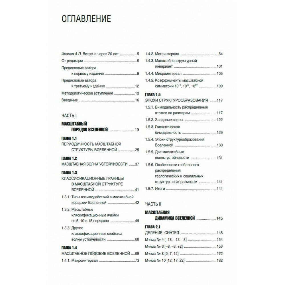 В книге все объекты Вселенной рассмотрены с точки зрения масштабного порядка, масштабной динамики и масштабной гармонии, что является ступенькой к построению общей теории систем. Приведены оригинальные гипотезы относительно иерархического строения Вселенной, "зерен мирового духа" и их информационной емкости, о невозможности термодинамической смерти Вселенной и неслучайного возникновения жизни, о существовании "барьеров синтеза-деления" на различных масштабных этажах, о диапазоне проявления пятой силы и др. Все гипотезы основаны на системном осмыслении хорошо известных в науке фактов, они приводят читателя к новому пониманию роли человека и человечества в мироздании, к осознанию существования в природе четвертого измерения (масштабной оси Вселенной), помогают исследователям выйти за рамки тесных дисциплинарных закономерностей и прокладывают пути для новых научных изысканий.