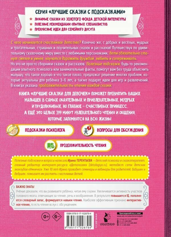 Очень понравилась серия, приобрела почти все книги, сказки подобраны по тематике (сказки о животных, для девочек, для мальчиков, для малютки, русские народные, сказки счастливого детства), нравится комментарий психолога, наводит на определенные темы обсуждения с ребенком. На примере сказок оказывается, надеюсь, хороший воспитательный эффект, понятный ребёнку. Что как не сказка позволяет приблизить ребёнка к реальной жизни.